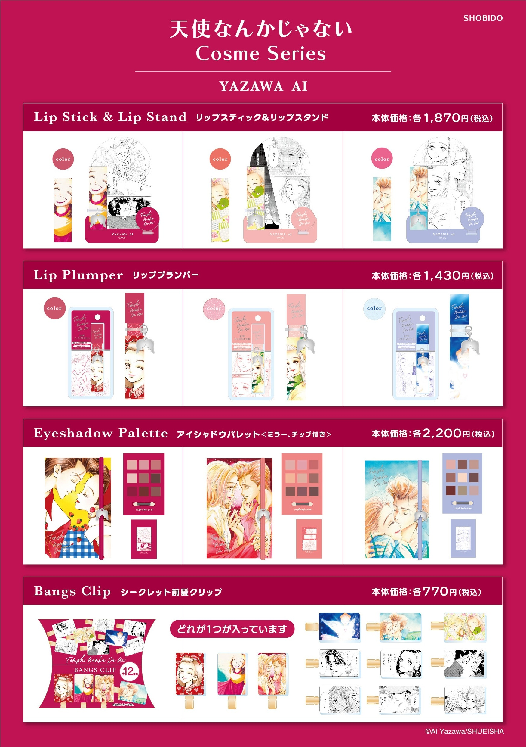 ラインナップは、使って飾れる「リップスティック&リップスタンド」、唇をうるおす「リッププランパー」、ミラーとチップ付きの「アイシャドウパレット」、そしてブラインド仕様でコミックの名シーンとイメージアートを厳選した12種類の「前髪クリップ」の全4アイテム。作品の魅力を感じながら毎日のメイク時間を楽しむ青春を感じさせる特別なひとときをお届けします。