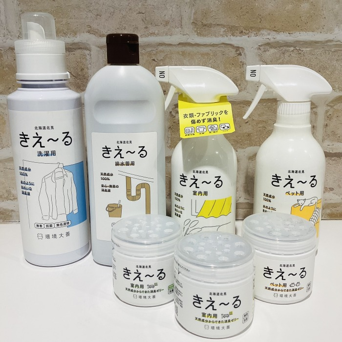 「きえ~る」シリーズは100%天然由来の原環境微⽣物群(乳酸菌等)を発酵・培養した「善⽟活性⽔」から⽣まれたバイオ消臭液です。