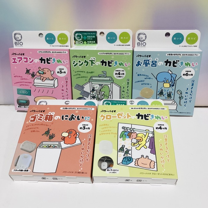 「パワーバイオ」シリーズは微生物の働きを利用して、カビ・臭いを抑制するお掃除アイテムです。「置くだけ」「貼るだけ」「吊るすだけ」で微生物が汚れを分解することでキレイを維持します。温度や湿度管理が難しい・何度掃除してもカビが生えるところにおすすめです。今だけイラストレーター・makomoさんの可愛い限定パッケージが登場しています。