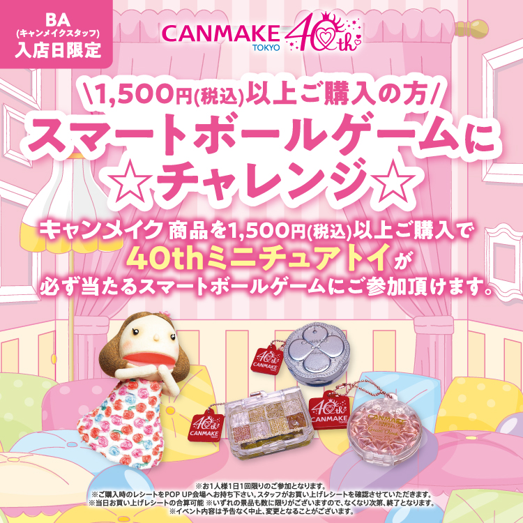 キャンメイクの新商品や人気商品を多数ご用意しております。またお買い上げプレゼントをはじめ、専門販売員が入店の日には税込1,500円以上お買い上げで「40thミニチュアトイ」が必ず当たるスマートボールゲームにチャレンジしていただけます!!