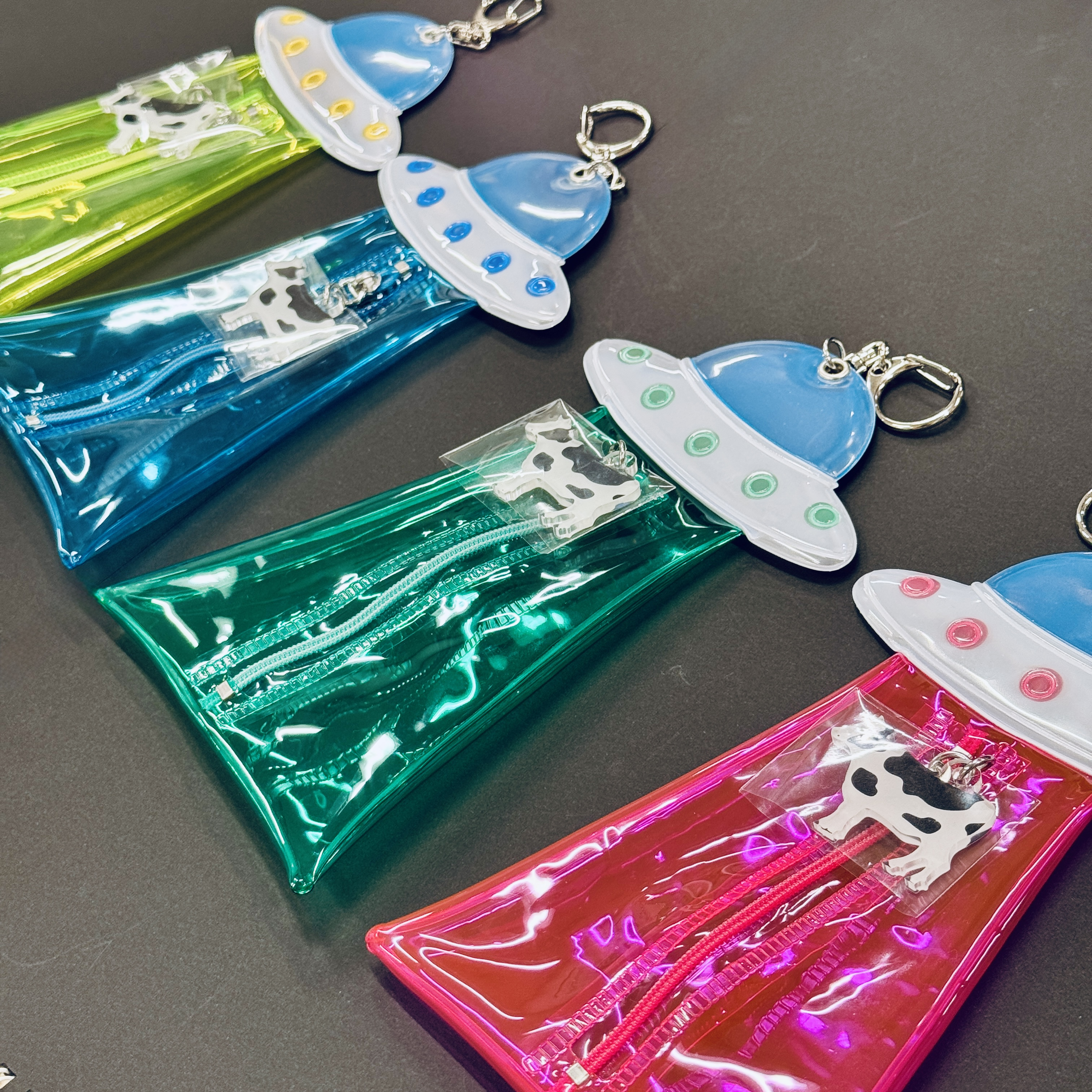 ユーモアなデザインの未確認飛行フラットポーチが登場。UFOに連れ去られる⁈ような牛のモチーフをあしらった小型のケースでカラビナ付きです。クリア素材で中身が見やすく、細かい道具の仕分けにも取り入れやすいうれしい構造。UFO部分には反射素材を使用。リュックなどに着けて夜間でも活躍します。ぜひ店頭でご覧ください。