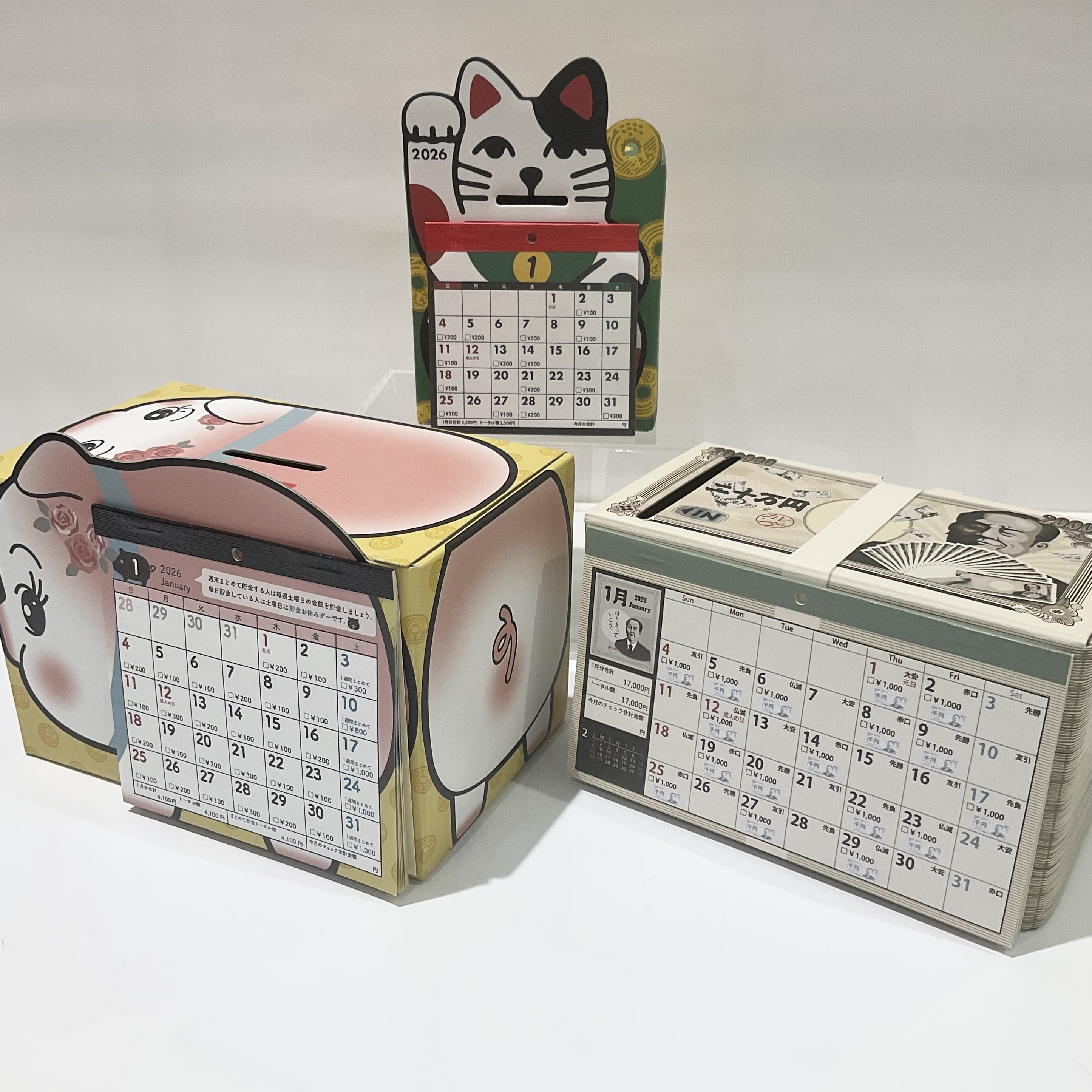 今回は毎年大人気の貯金箱カレンダーをご紹介いたします。カレンダーに記載されている金額を貯金箱に入れていくだけで、目標金額まで貯金することができます!1人でコツコツと貯めるのはもちろんのこと、家族と協力しながら楽しく貯金することもできます。ぜひ店頭でお手に取ってご覧ください。
