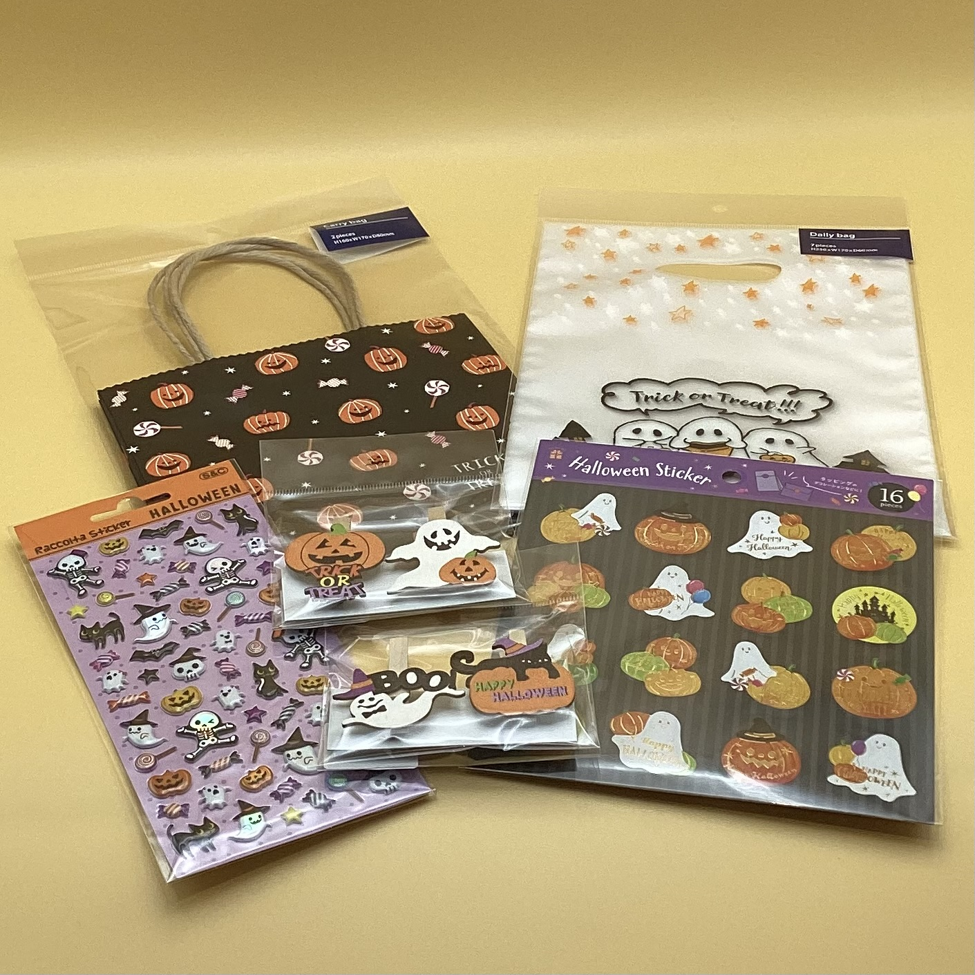 ラッピングを止めるのに使えるシールや使うだけでハロウィン感が出るクリップもございます。