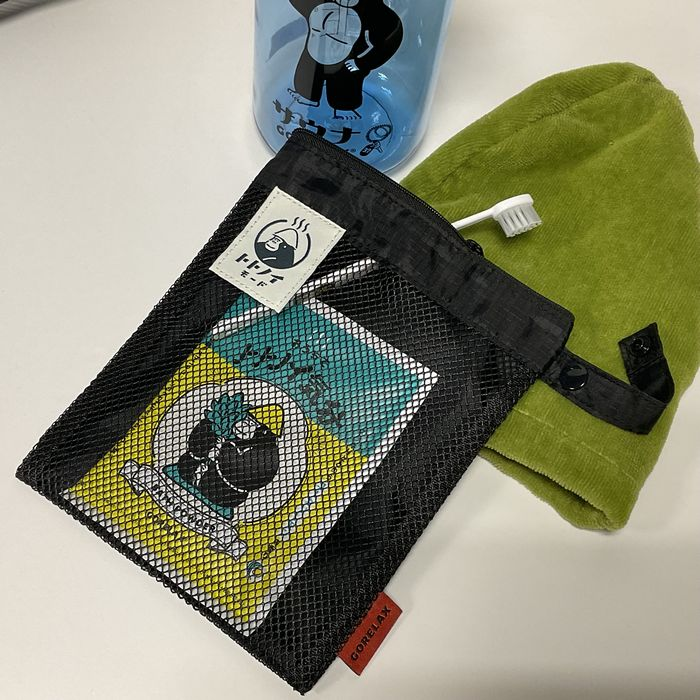 ゴリラの『まもるさん』がトレードマークのサウナブランド、『ごリラックス』より使い勝手の良いバッグとポーチが登場しました。バッグは本体付属の袋にコンパクトに収納することができ、ポーチは仕切りがあるので小物を分けて収納できます。メッシュ素材で通気性が良く、サウナはもちろん日常使いでもトトノウ便利なアイテムです。展開売り場では、ごリラックスのサウナハットやサウナマット、ボトルなどサウナに欠かせないアイテムをご用意しております。