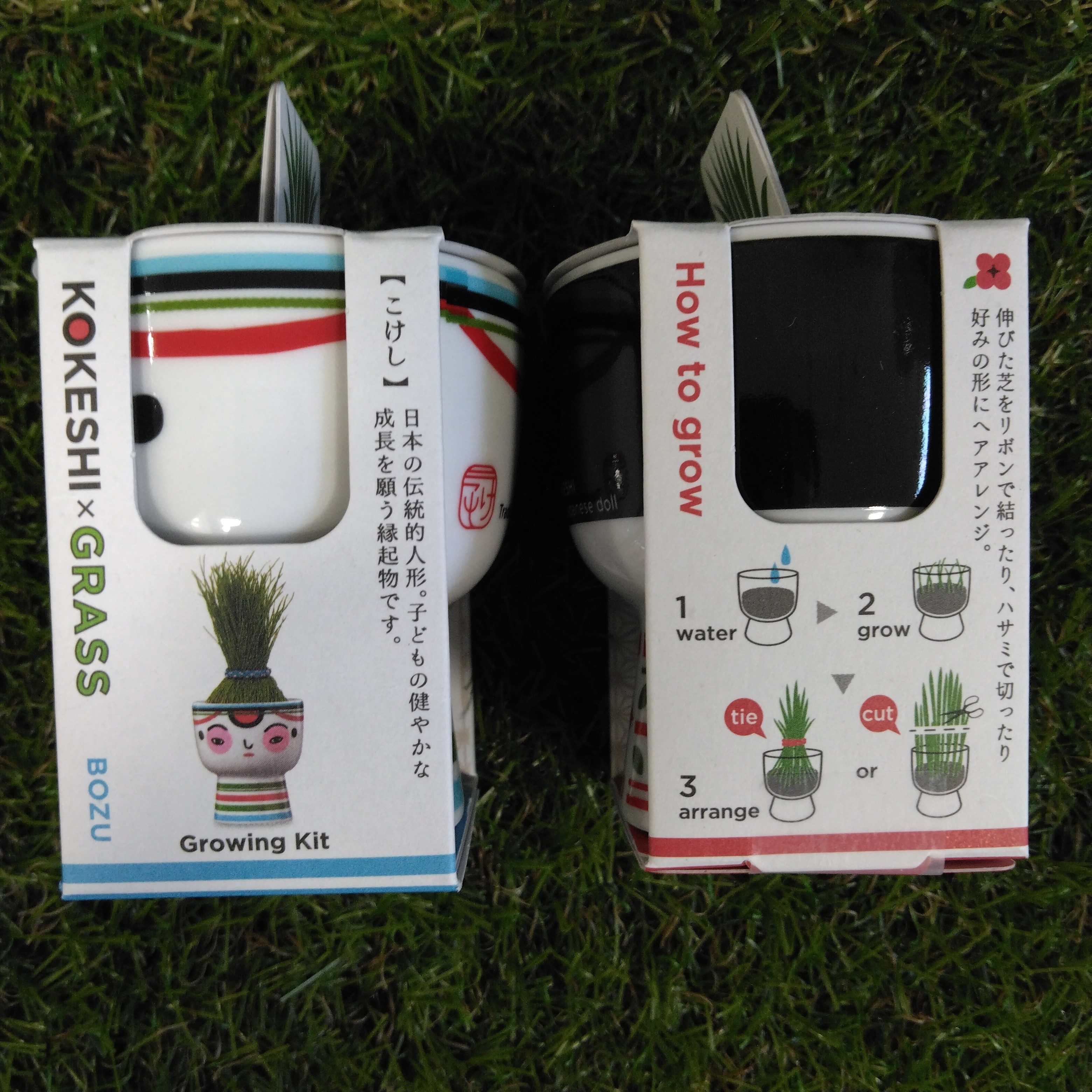 こけしの入れ物に入れて、水だけで成長する芝を栽培することができます。【こけし】とは日本の伝統人形で、子供の健やかな成長を願う縁起物です。
