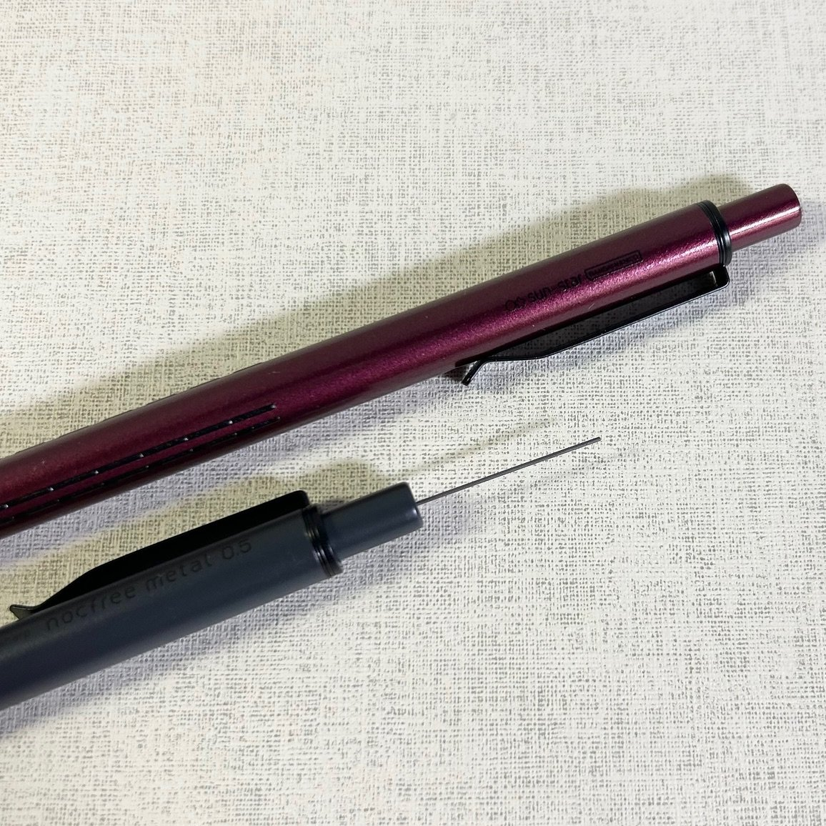 自動芯出し機構を搭載したオートマチックシャープ「nocfree(ノクフリー)」から、軸にアルミを使用した高級感のある「nocfree metal(ノクフリーメタル)」が登場しました。自動芯出し機構とは、筆記時にペン先が紙面に当たり上下運動をすることで、自動的に芯が送り出される仕組みです。都度ノックする手間から解放されるため、集中力が途切れにくいといわれています。また、ノックキャップを外さずにキャップ中央に空いている穴から直接芯を補充することができる新機構も特徴です。