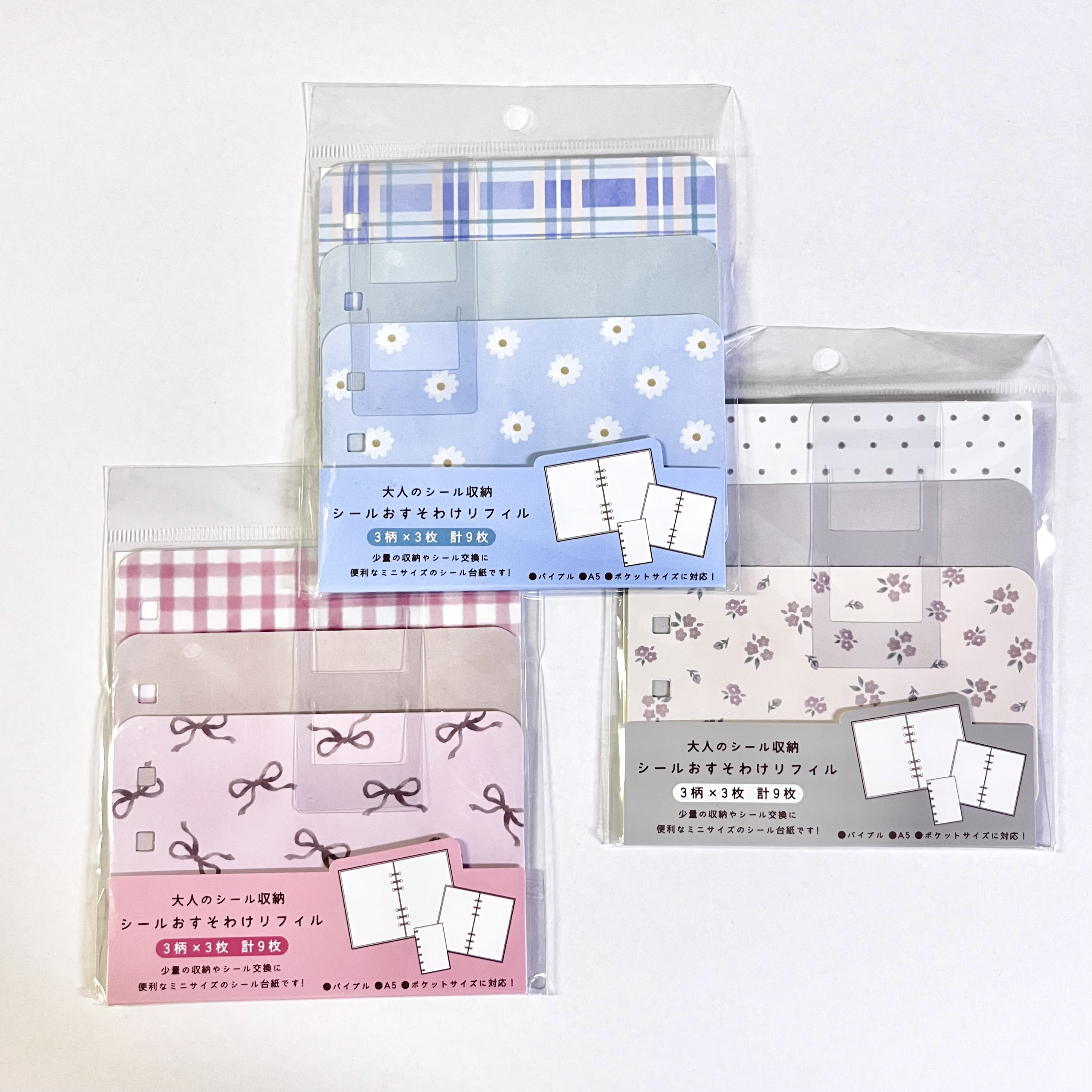 大人のシール帳から出ている、3つ穴タイプのコンパクトなシール台紙。シール台紙ごとの交換や、おすそわけ、少量のシールを収納をするのにぴったりなサイズです。3種類の柄が3枚ずつ入った計9枚入りで、大人のシール収納バインダーはもちろん、A5・バーチカル・ミニタイプにも使用できます。相手のイメージに合わせたシールを「おすそわけリフィル」に詰め込んで、シール台紙ごと交換して楽しんでみてはいかがですか。