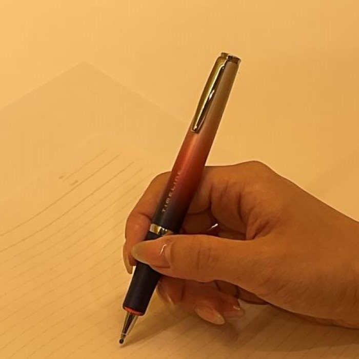 「タイムライン」は、2005年より発売する、過去・現在・未来・永遠という時間軸をテーマにした独創的な形状の油性ボールペンで、2025年に発売20周年を迎えます。この特別な節目を記念して、数量限定モデルとして、同シリーズ初の3色のグラデーションを採用。ボディには夢を叶えるための強い意志をネイビーで表現し、その先に見える明るい未来をブラッドオレンジからホワイトへと移り変わるグラデーションで表現しています。本体ボディを回すことで、口金とペン先部分を2段階で出し入れでき、携帯時には口金まで収納されるので、ポケットやカバンの中を汚す心配がなくなります。時間を忘れて書き続けられる抜群性のフィット感と滑らかな操作性を店頭でぜひお試しくださいませ。