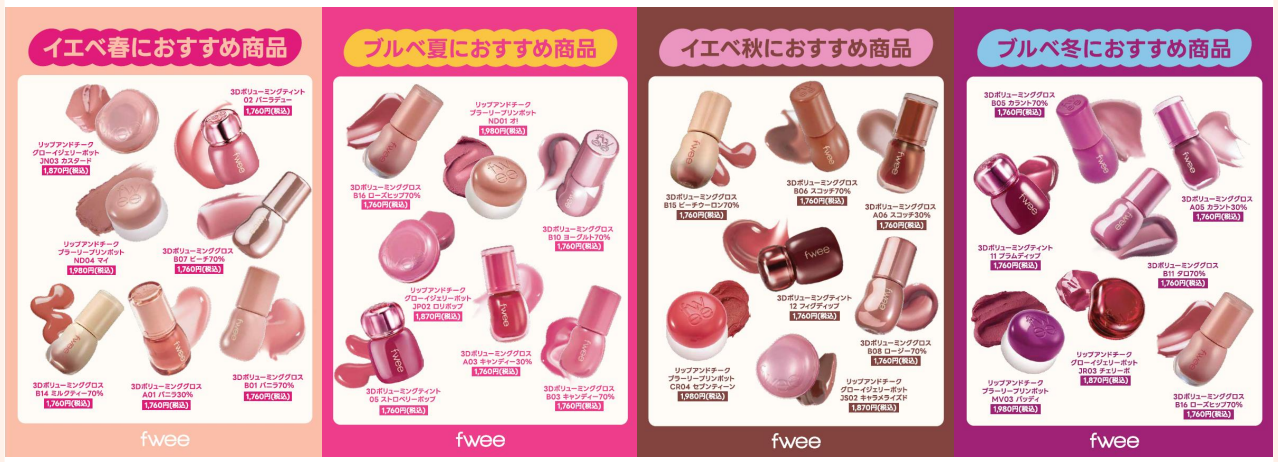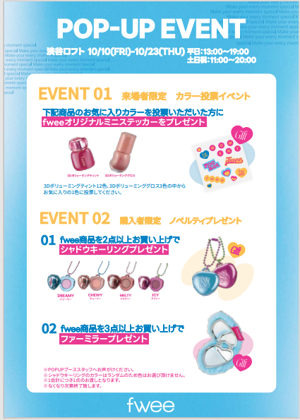 韓国コスメブランド「fwee」の新商品「3Dボリューミンググロス」の日本限定カラー「Sweet Afternoon Moment」や、「3Dボリューミングティント」などをそろえました。お気に入りの1色を選ぶカラー投票イベントや、購入点数に応じたお買上げプレゼントもご用意しています。