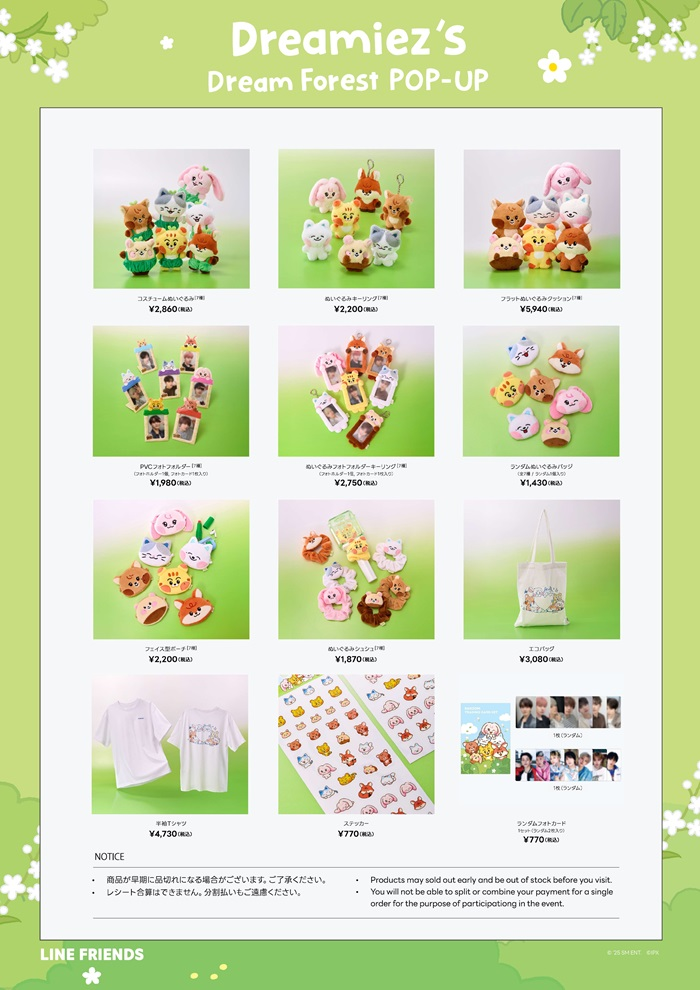 LINE FRIENDSとNCT DREAMが一緒に作ったキャラクター「Dreamiez」(ドリーミーズ)の初ポップアップを開催!「ドミーリーズ合唱団が歌うドリーム森」がテーマの今回のポップアップでは、ぬいぐるみやフォトカードホルダー、フェイスポーチ、Tシャツなどがラインナップ。