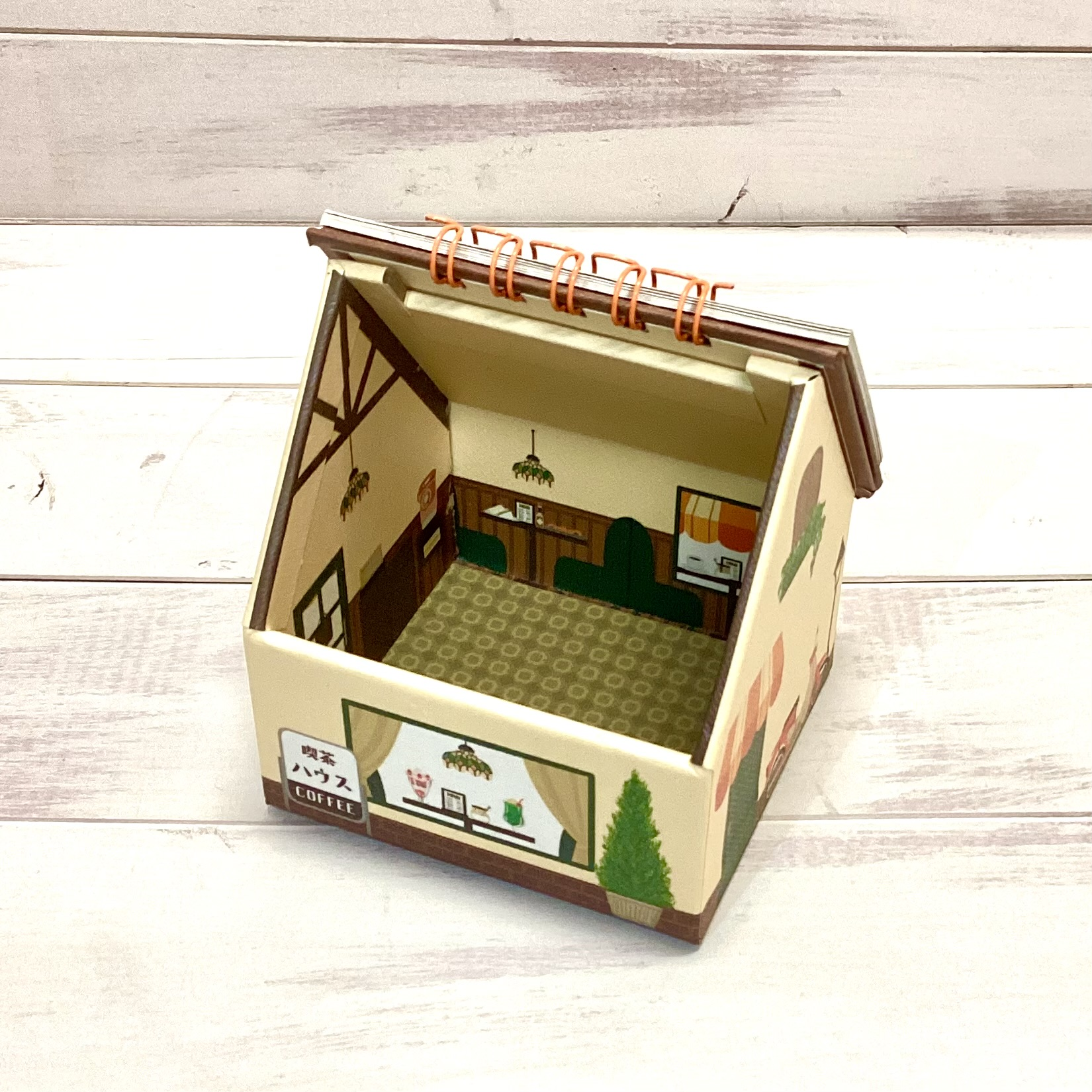 手のひらに収まるサイズ感で喫茶店や理容店などのお店をモチーフにしています。屋根の部分をめくるとカレンダーになります。