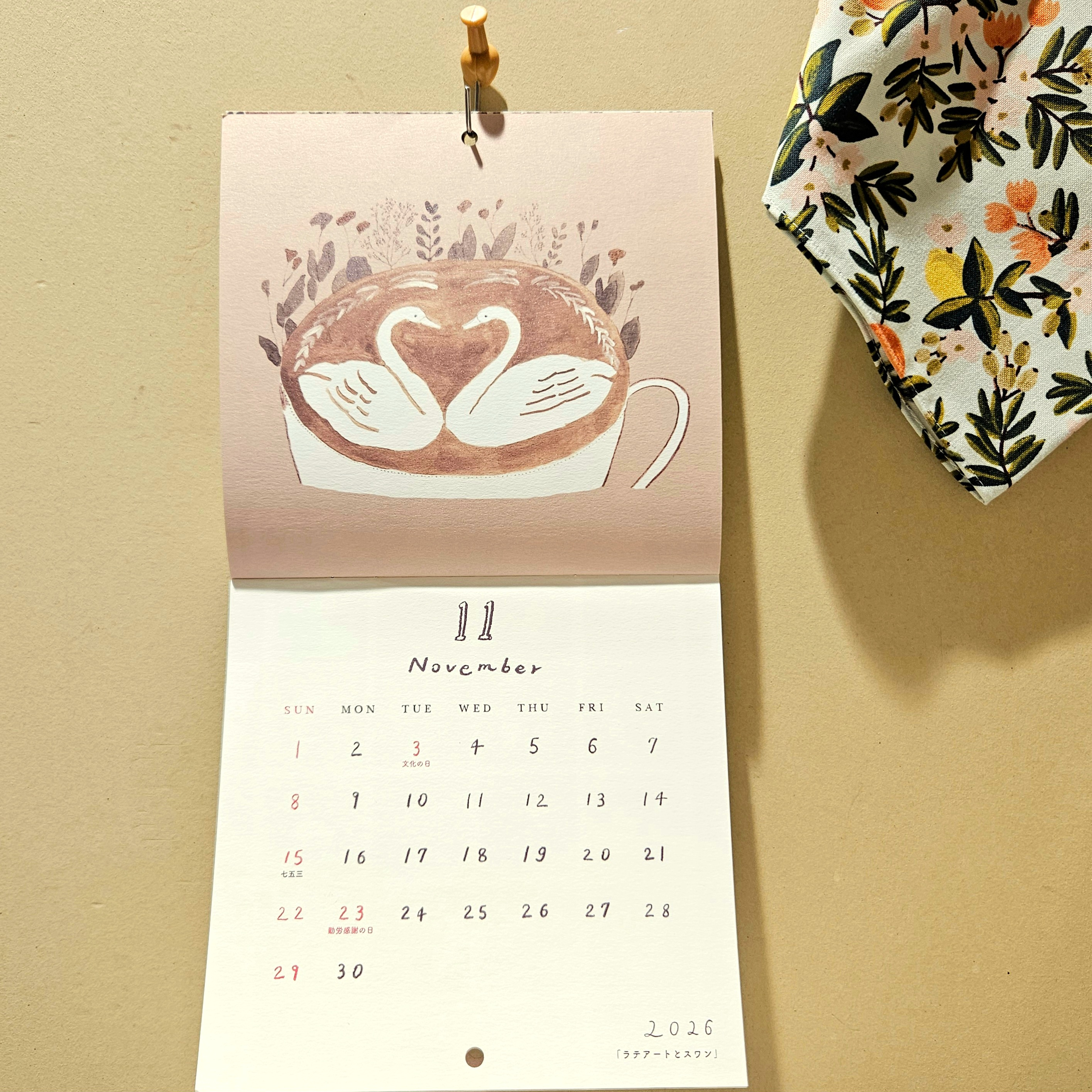 白鳥がお菓子の一部になっているちょっと不思議なイラストと、柔らかな色使いが特徴のトビマツさん。カレンダー部分はほんの少し黄色味のある紙に手書き風フォントの数字が、トビマツさんの柔らかなイラストにとてもマッチしています。