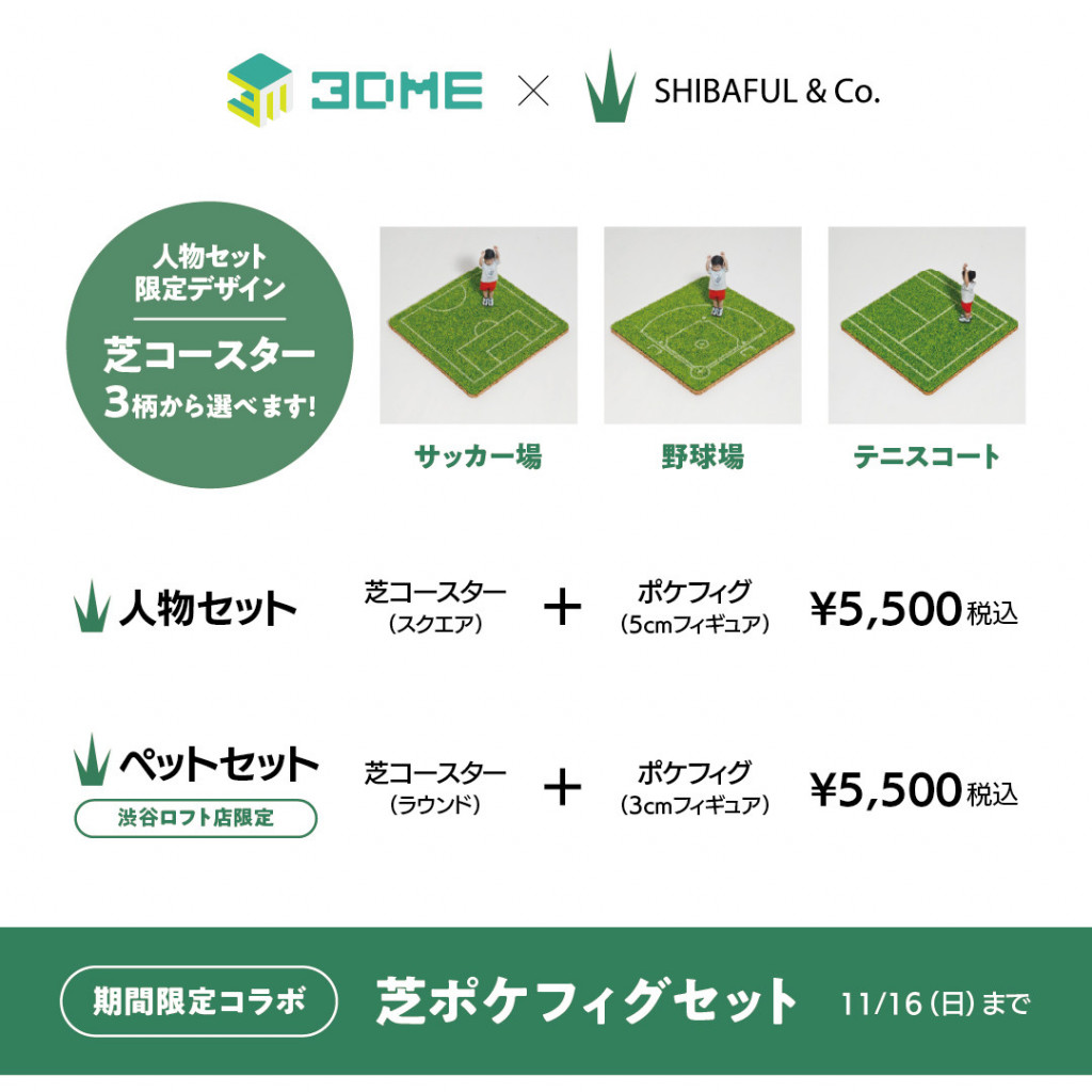 オリジナルの3Dフィギュアを作ることができる「3DME(スリーディーミー)」に、“芝生のある心地よさ”をテーマにしたプロダクトブランド「SHIBAFUL(シバフル)」とタッグを組んだ新メニューが期間限定で登場しました。