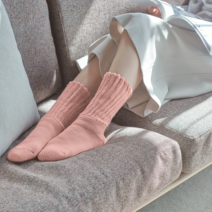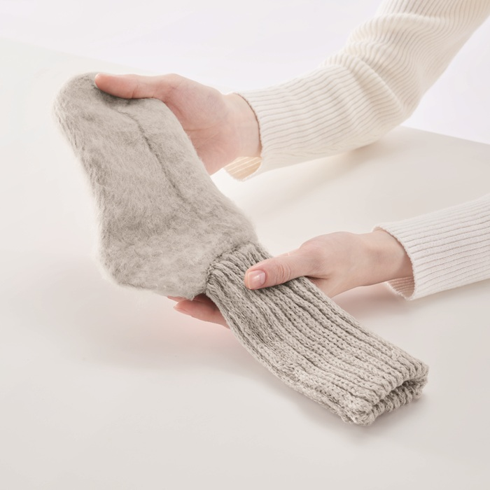 長い毛足が体温をキャッチして保温する極起毛で、魔法瓶のような保温効果が特徴です。足首より上は締めつけ感のないリラックスリブになっており、伸ばして履いても、たるませてクシュっとさせてもかわいく履くことができます。