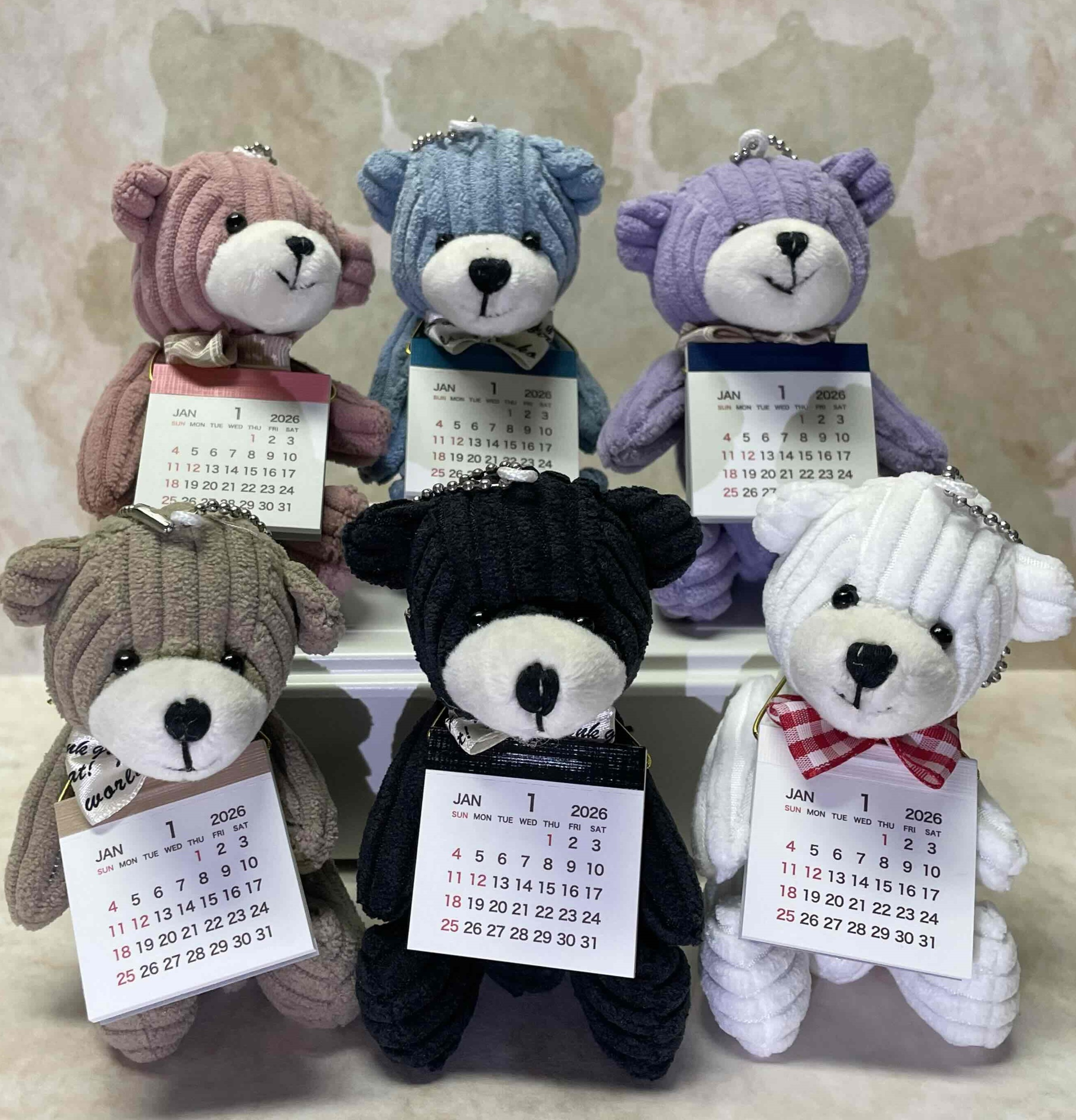 かわいいクマのぬいぐるみに、カレンダーが付いた「ベアカレンダー」。ボア素材とコーデュロイ素材の2タイプをご用意しています。小さいサイズでデスクに置きやすく、ボールチェーンが付いているのでフックなどに掛けてもお使いいただけます。カレンダー使用後は、キーホルダーとしてカバンやスマホなどにつけるのもおすすめです。ぜひ店頭でご覧ください。