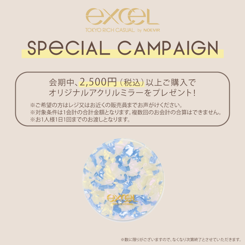 会期中、エクセル商品をお1人さま1会計につき税込2,500円以上お買上げで「オリジナルアクリルミラー」を1点プレゼントいたします。