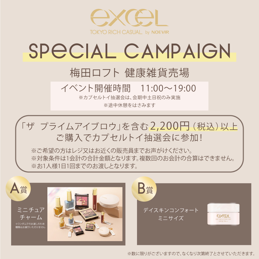 さらに下記期間中、「ザ プライムアイブロウ」を含むエクセル商品をお1人さま1会計につき税込2,200円以上お買上げで、「ミニチュアチャーム」などが当たるカプセルトイ抽選会に1回ご参加いただけます。