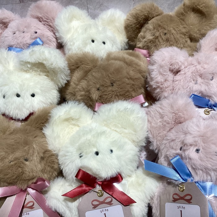 大きなお耳にコロンとした丸い尻尾、モフモフの肌触りが気持ちいいぬいぐるみが、ゴムバンド製のカレンダーを持っています。