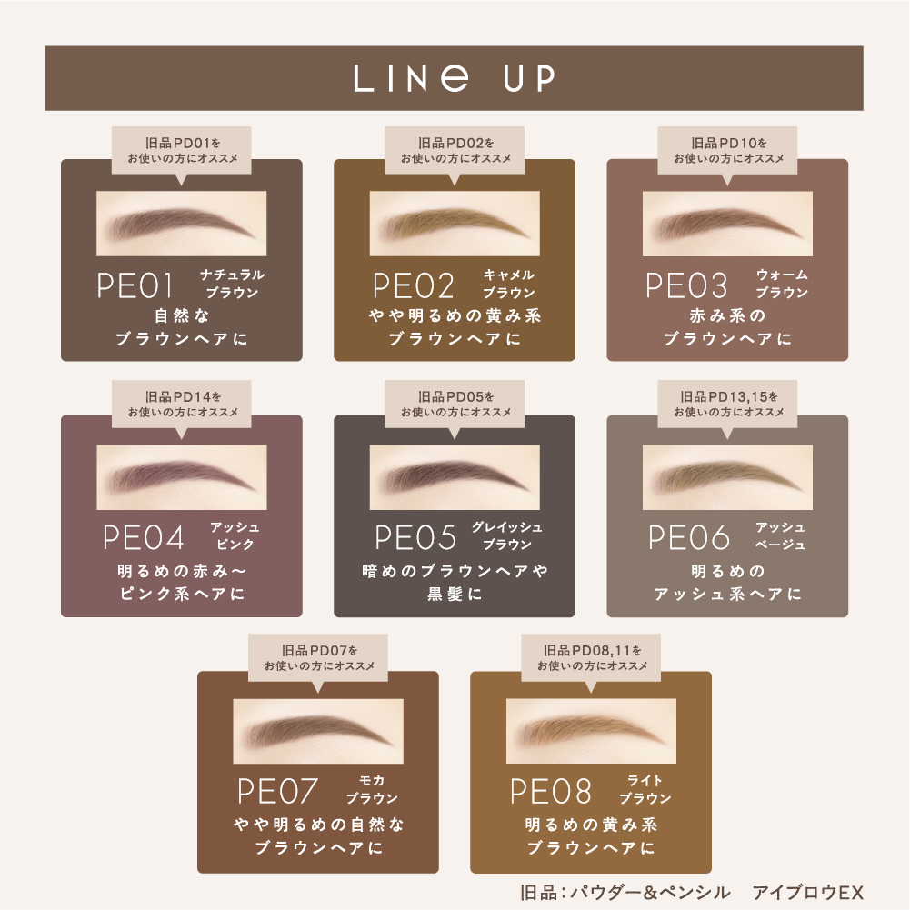 新色アッシュベージュを含めた全8色がラインナップ。さらになめらかな描き心地になったペンシルと新処方でふんわり感がアップしたパウダーで、自然で立体的な眉毛に仕上がります。ウォータープルーフ処方がさらに落ちにくくさもパワーアップ‼︎