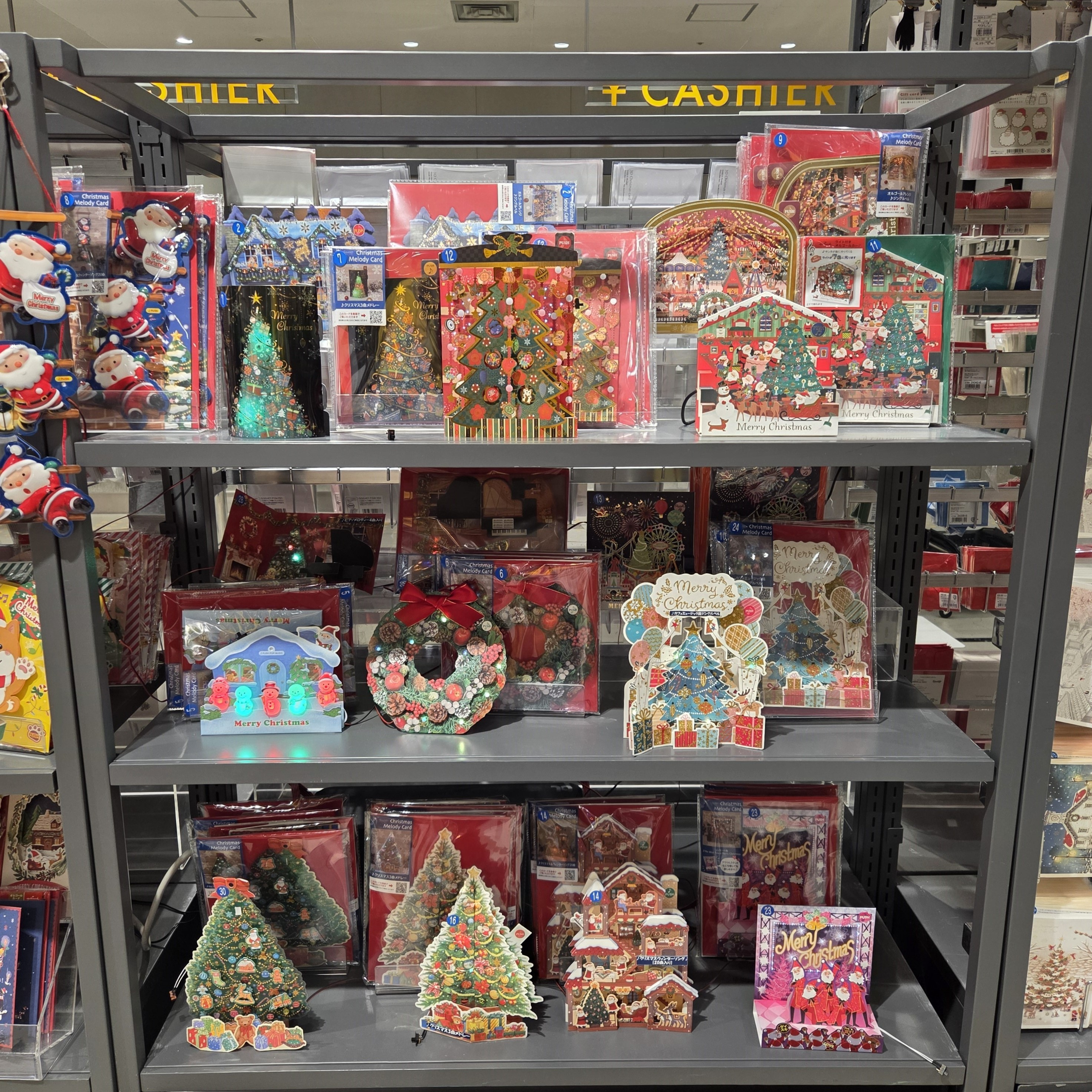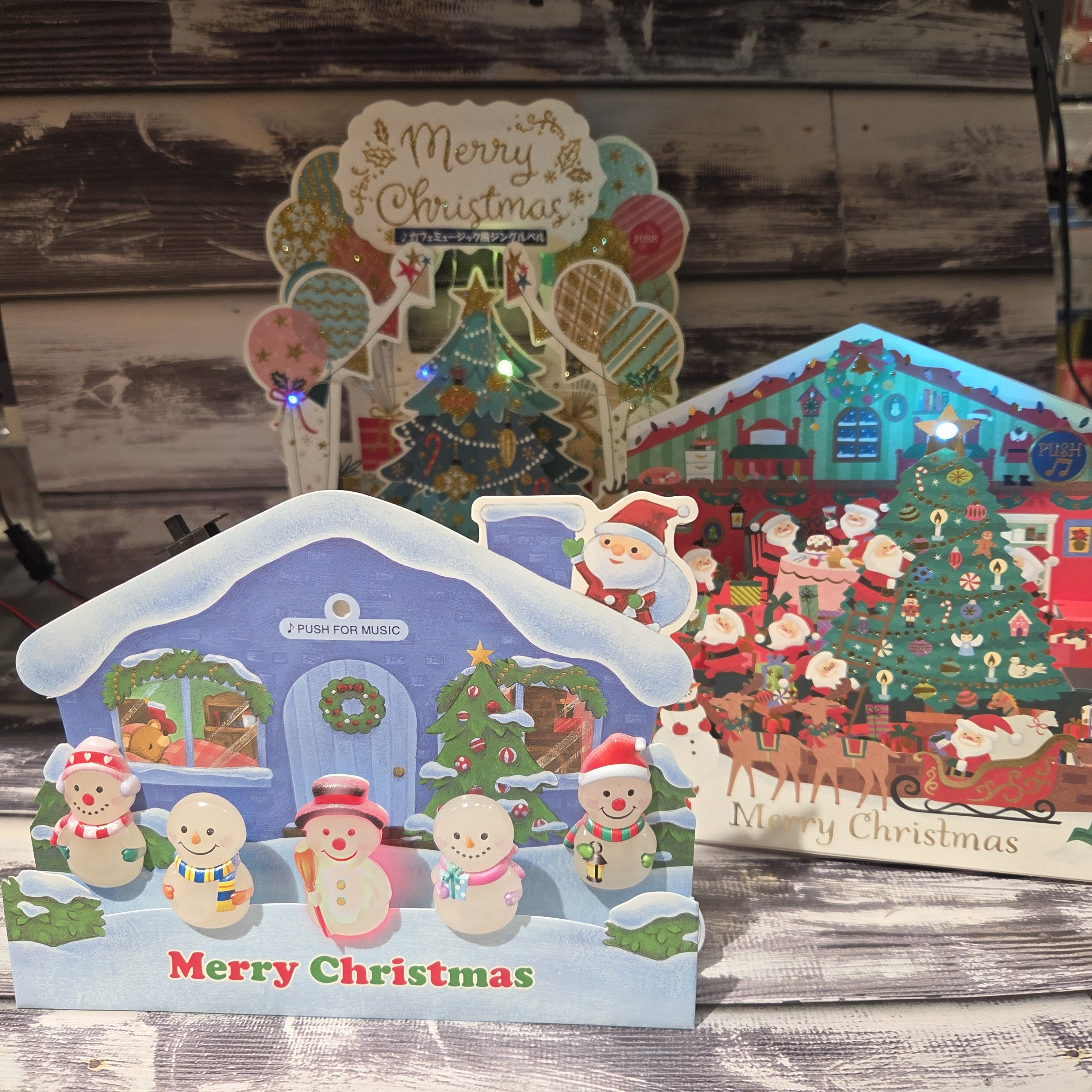 サンタクロースのイラストが書かれているカードだけでなく、クリスマスツリーやクリスマスの装飾で彩られている街並みに光とクリスマスの音楽のギミックがついているカード、動物がモチーフになっていて動物の鳴き声でクリスマスの音楽が奏でられているカードなど、様々な種類のメロディーカードを取りそろえました!