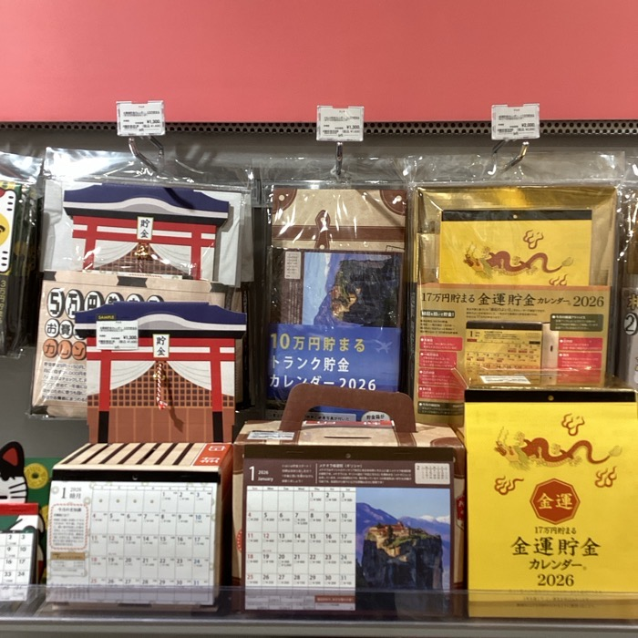 今回は文具売場から貯金箱カレンダーのご紹介です。