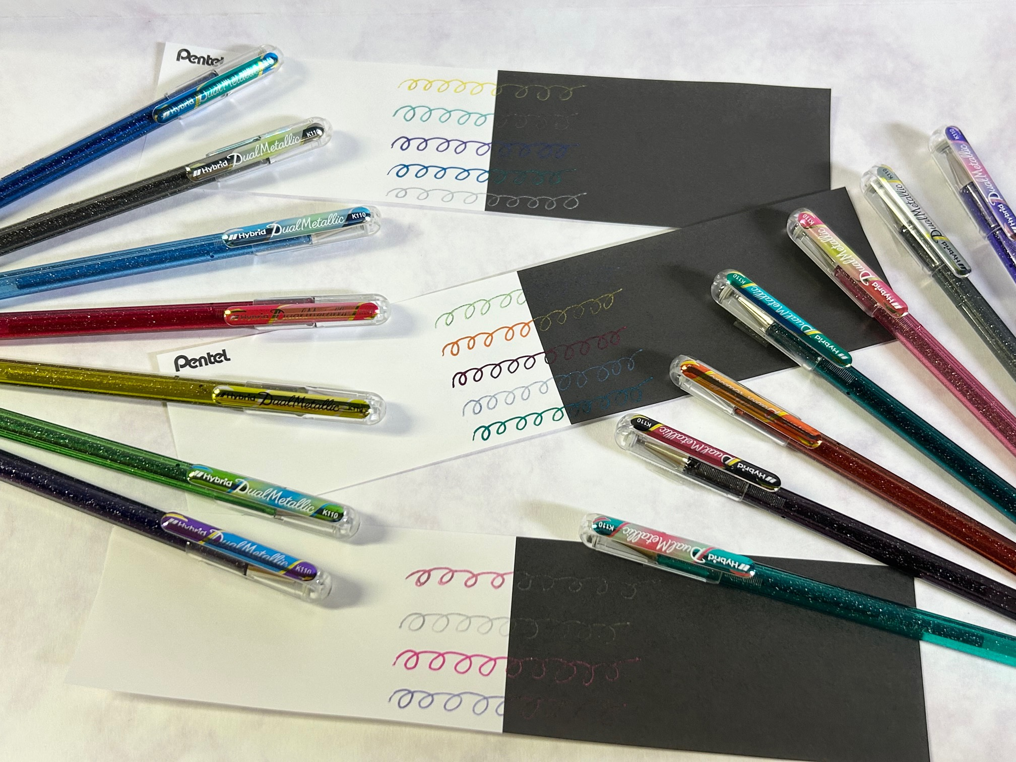ぺんてる株式会社から発売の、ゲルインキボールペン「デュアルメタリック」。鮮やかな発色の染料と、グリッター顔料を異なる色同士で組み合わせているため、見る角度や紙の色に応じて色の見え方が変わります。白い紙では鮮やかに、黒などの濃く深い色の紙ではグリッターの輝きが際立ち幻想的に発色するため、1本でいろいろな表現をお楽しみいただけます。ノートやイラストなどのデコレーションにいかがですか。