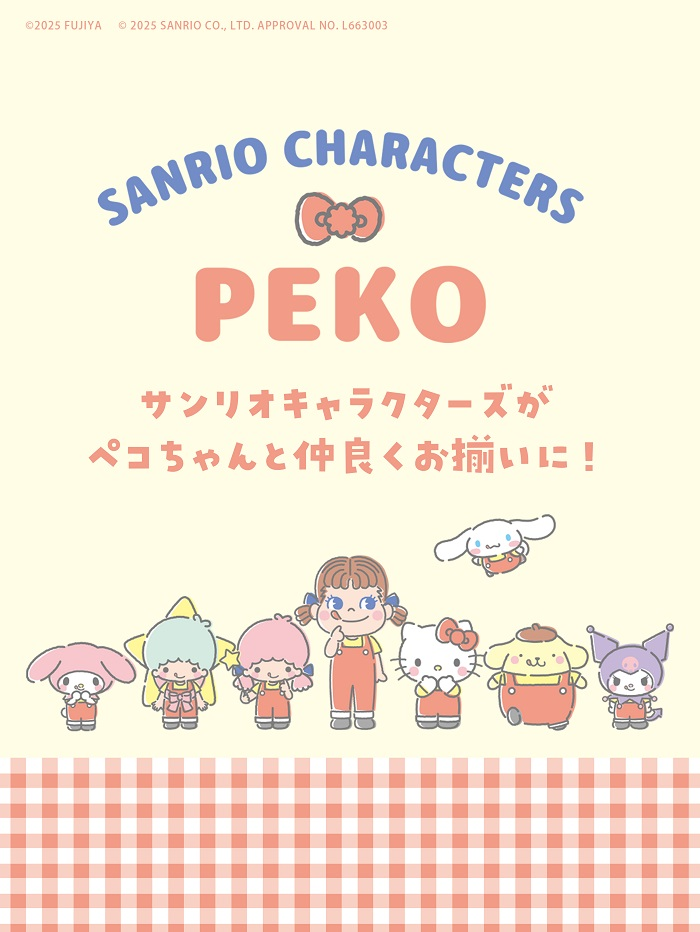 おそろいの服を着たサンリオキャラクターズとペコちゃんが大集合!ペコちゃんと同じ表情をまねっこしている姿が、とってもキュート。仲良しな雰囲気と特別感あふれるデザインで、見ているだけで笑顔になれるコラボです。