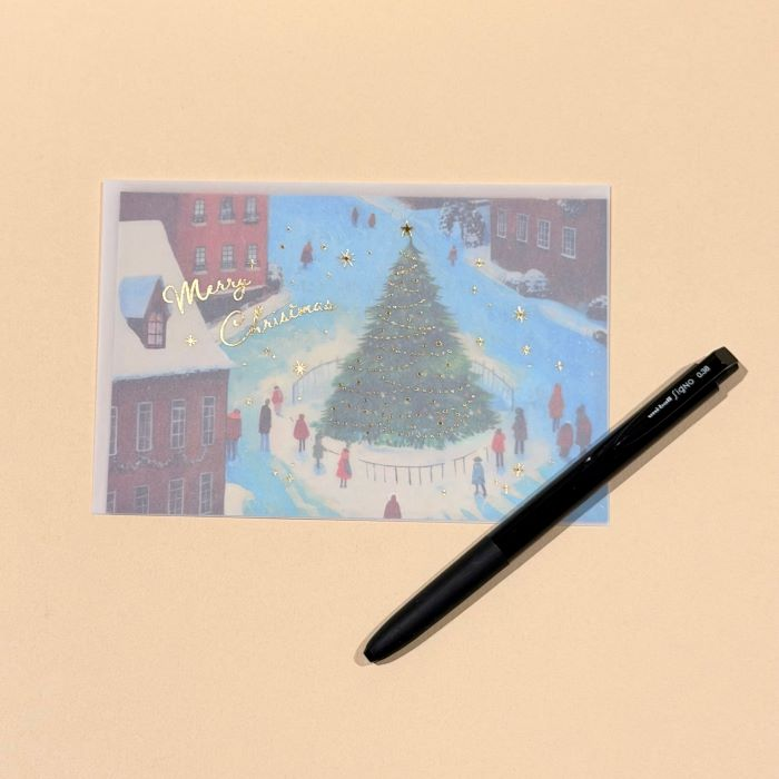便箋の裏面にクリスマスの街並みを表現したイラストが描かれており、金箔で工夫されたトレーシング素材の封筒にいれることで大きなクリスマスツリーがまるで点灯しているかのようにキラキラと輝きます!