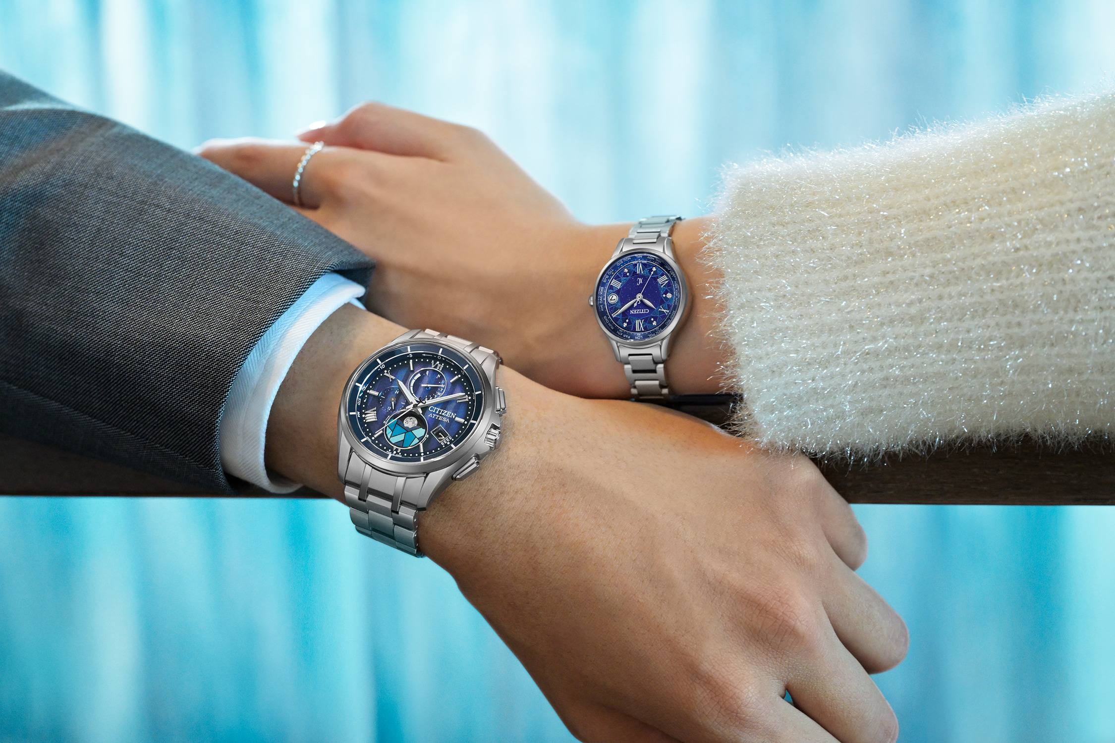 2025年のテーマは「Stained glass」。冬の静けさの中、ステンドグラスから差し込む光をイメージ。メンズの「アテッサ」はルナプログラム機能が搭載されたモデルを採用し月の満ち欠けを知らせるとともに月明かりをイメージさせ、優雅さを演出。レディースの「クロスシー」はインデックスにローマ数字とカットパーツ、9時位置にはラボグロウン・ダイヤモンドをセッティングし、時計全体の美しさを引き立てます。