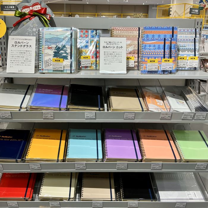 また、ステンドグラスのデザインのほかに編み目模様で冬らしいモチーフを集めたニット風のデザインや、光で輝くメタリックカラーやシンプルなものなど、様々な種類のノートをご用意しております。
