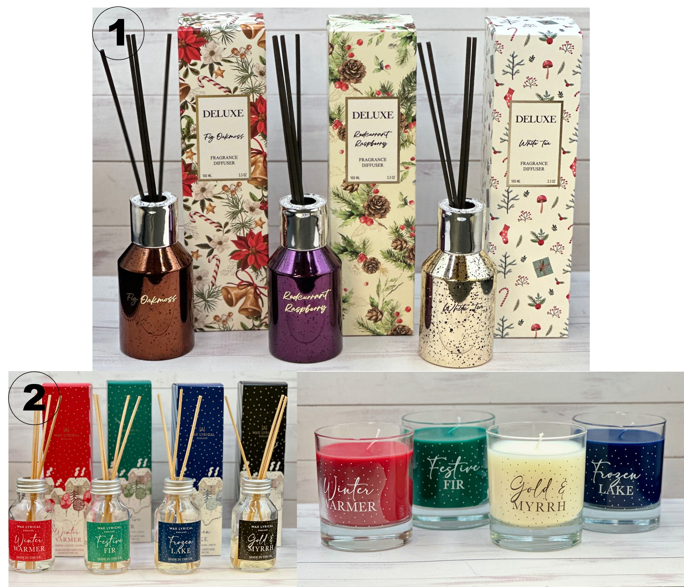 ②Xmasエディション・グラスキャンドル/リードディフューザー (各種) 税込2,970円