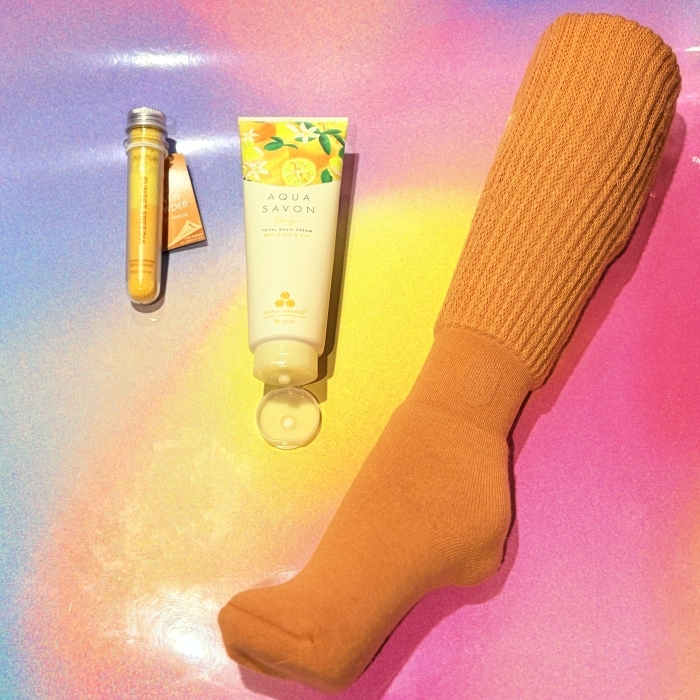 仕上げに、サンタンオレンジ色の保温ソックスを履けば足先からぬくもりがふわっと広がっていきます◎