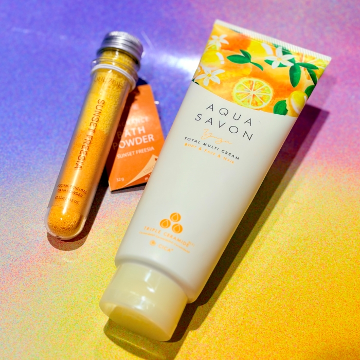 サンセットフリージア香る入浴剤は、お湯に溶けると夕焼けのような色が広がり、ふんわり甘い香りに包まれるご褒美のバスタイム。お風呂上がりは、ゆずとシャボンのやさしい香りに包まれるマルチクリームでしっとり保湿。