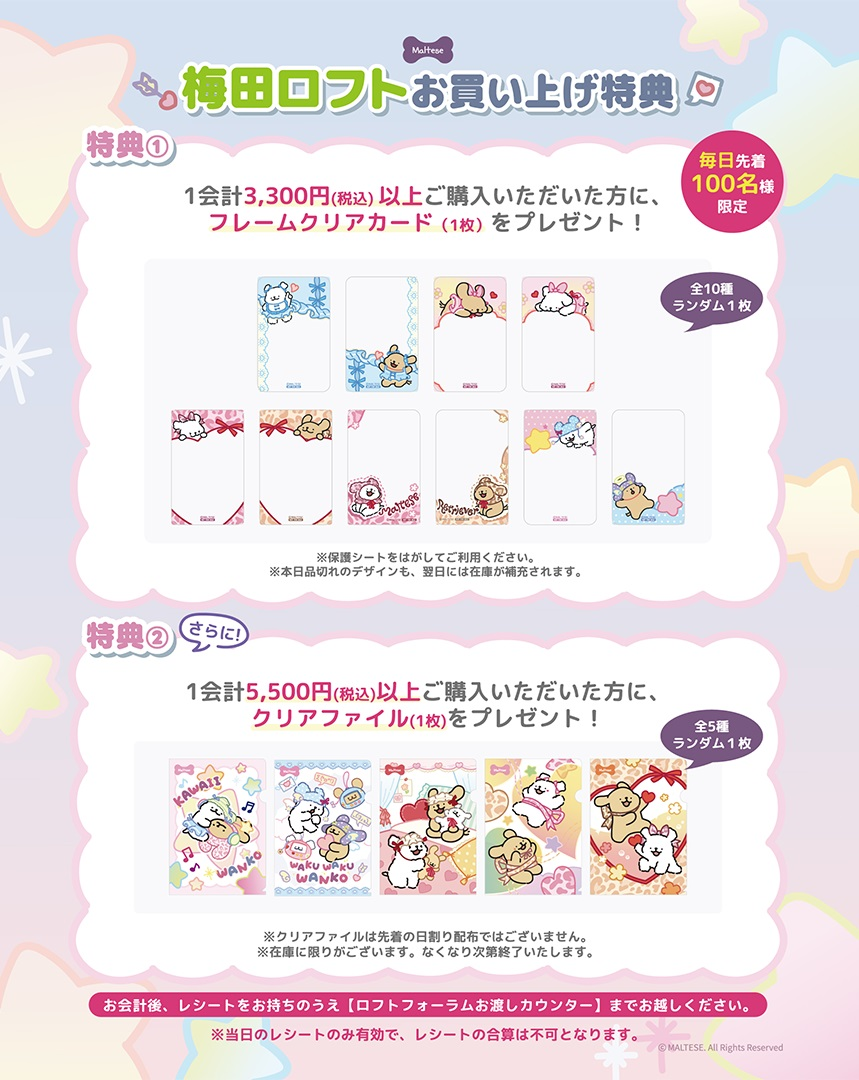 さらに、会場にて商品をお1人さま1会計につき税込5,500円以上お買上げいただいたお客さまに『クリアファイル』(全5種)をランダムで1枚をプレゼントいたします。