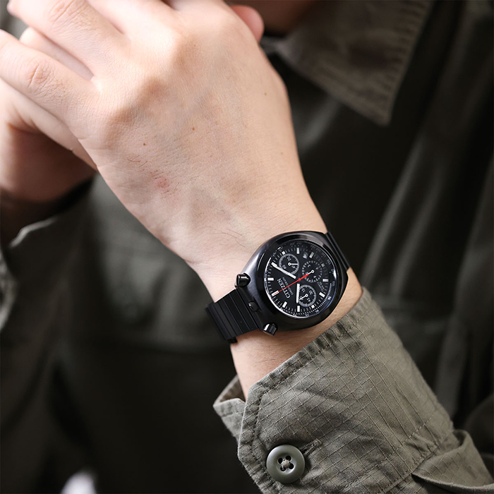 ケースの12時側に配置されたプッシュボタンがツノのように見えることから、「ツノクロノ」の愛称で呼ばれています。オールブラックを採用し、武骨かつ精悍で男心をくすぐるデザインに仕上げました。