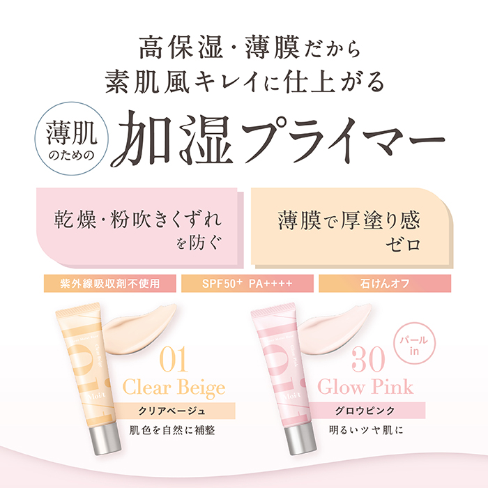 「モイット」は高保湿・薄膜なので、毛穴・色ムラを補整し乾燥くずれを防ぎ、素肌風キレイに仕上がります。ちゅるんと伸びて、しっとり肌をキープ!SPF50+ PA++++ 紫外線吸収剤不使用で、せっけんで落とせるのもポイントです。