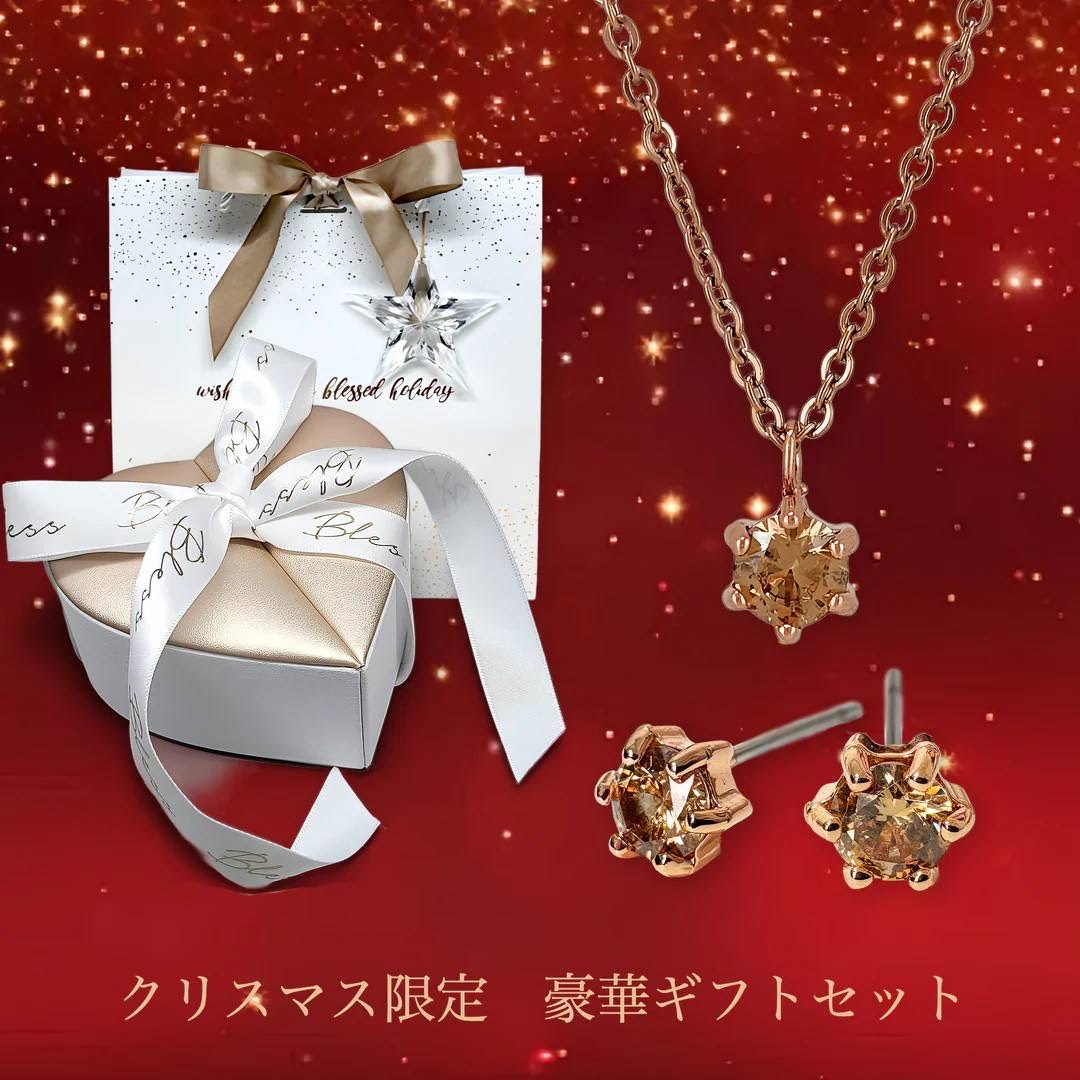 シャンパンカラーのストーンがきらめくネックレス&ピアスは、上品で肌なじみの良いローズゴールドカラーで、女性らしさを引き立てる人気デザイン。デイリーにも特別な日にも合わせやすく、ひとつ持っておくと重宝するジュエリーです。かわいらしいデザインのハートボックスと、ホリデーシーズン限定のショッパーが付属しています。