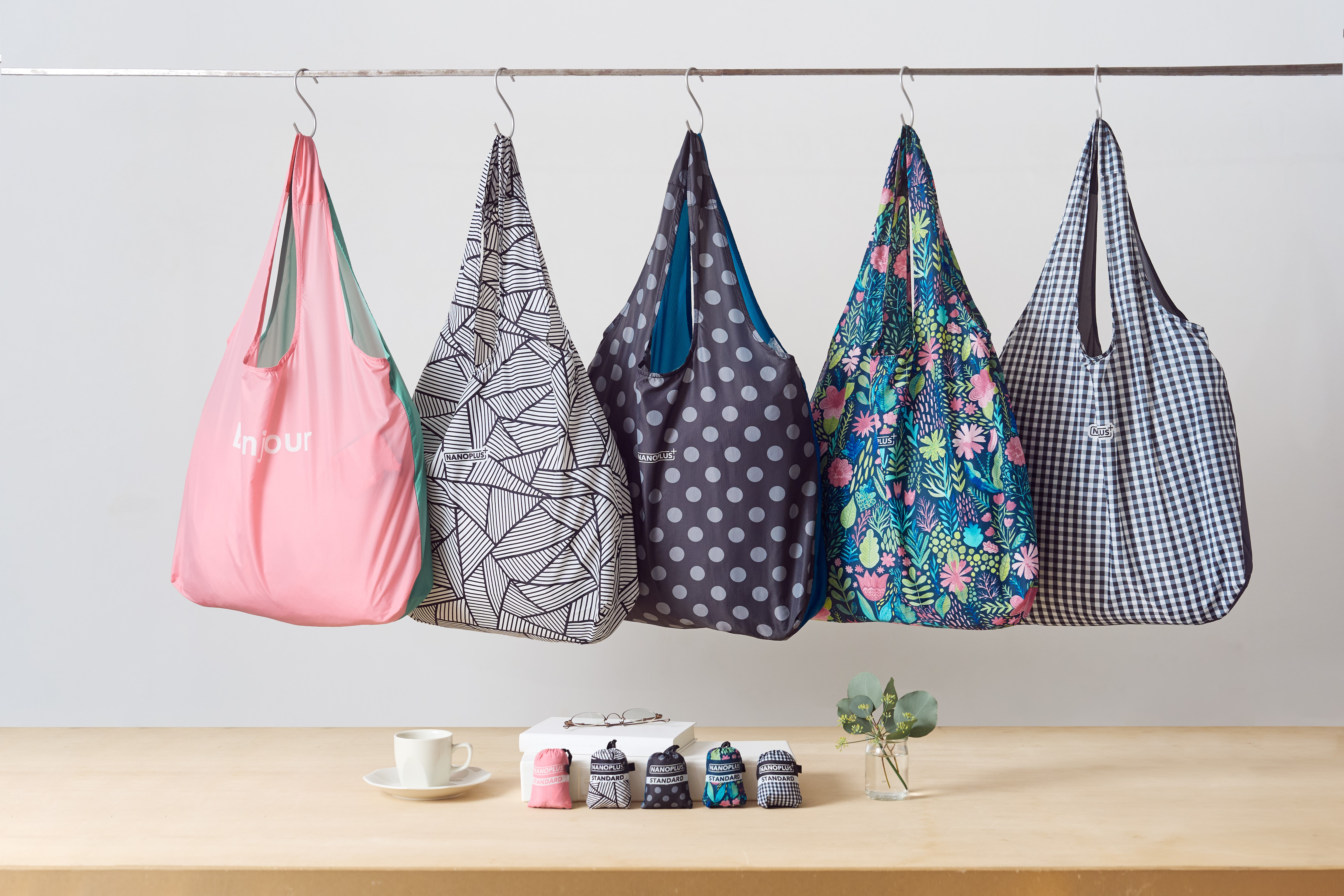 軽量・コンパクト・丈夫が特徴の究極のエコバッグ『nanoplus(ナノプラス)』。重さはわずか25g、手の平にすっぽり収まるコンパクト感ながらも容量は19L(※スタンダードサイズ)と使いやすいサイズとなってます。エコバッグは、正しく折り畳まないと収納袋に入れられないことが多いですが、ナノプラスは薄いナイロンを使用しており、簡単に収納袋に入れることができます。また収納袋は本体に結んでおくことができて紛失を防ぎます。