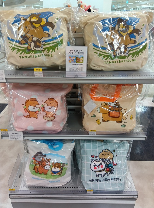 こんにちは、大分ロフトです。人気コミック「タヌキとキツネ」のハッピーバッグ2026が登場!2026年の干支である「馬」に乗り草原を駆るタヌキとキツネのトートバッグに限定グッズが入っています。