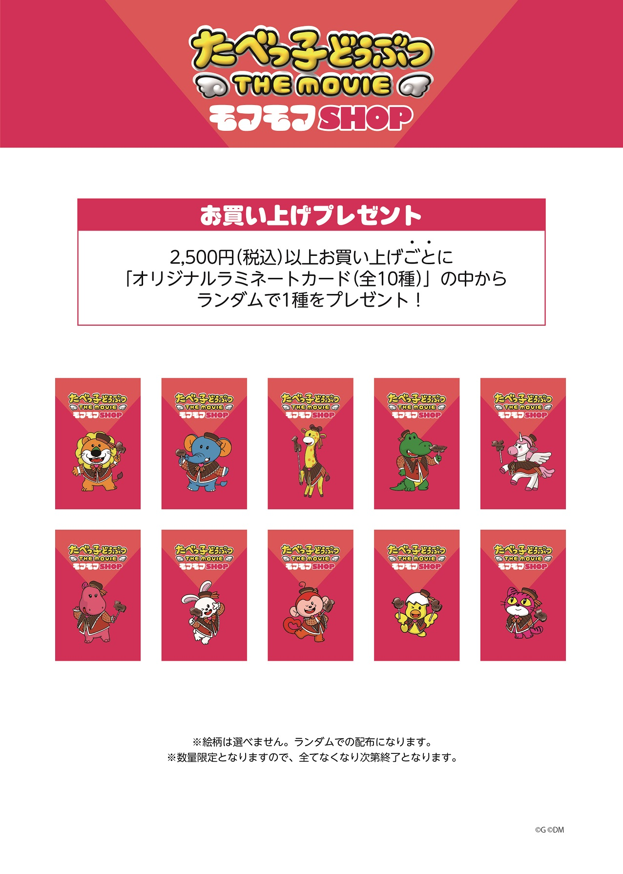 たべっ子どうぶつ THE MOVIE商品を、おひとりさま1会計税込2,500円以上お買上げごとに、先着で「オリジナルラミネートカード(全10種)」をランダムで1枚プレゼント。