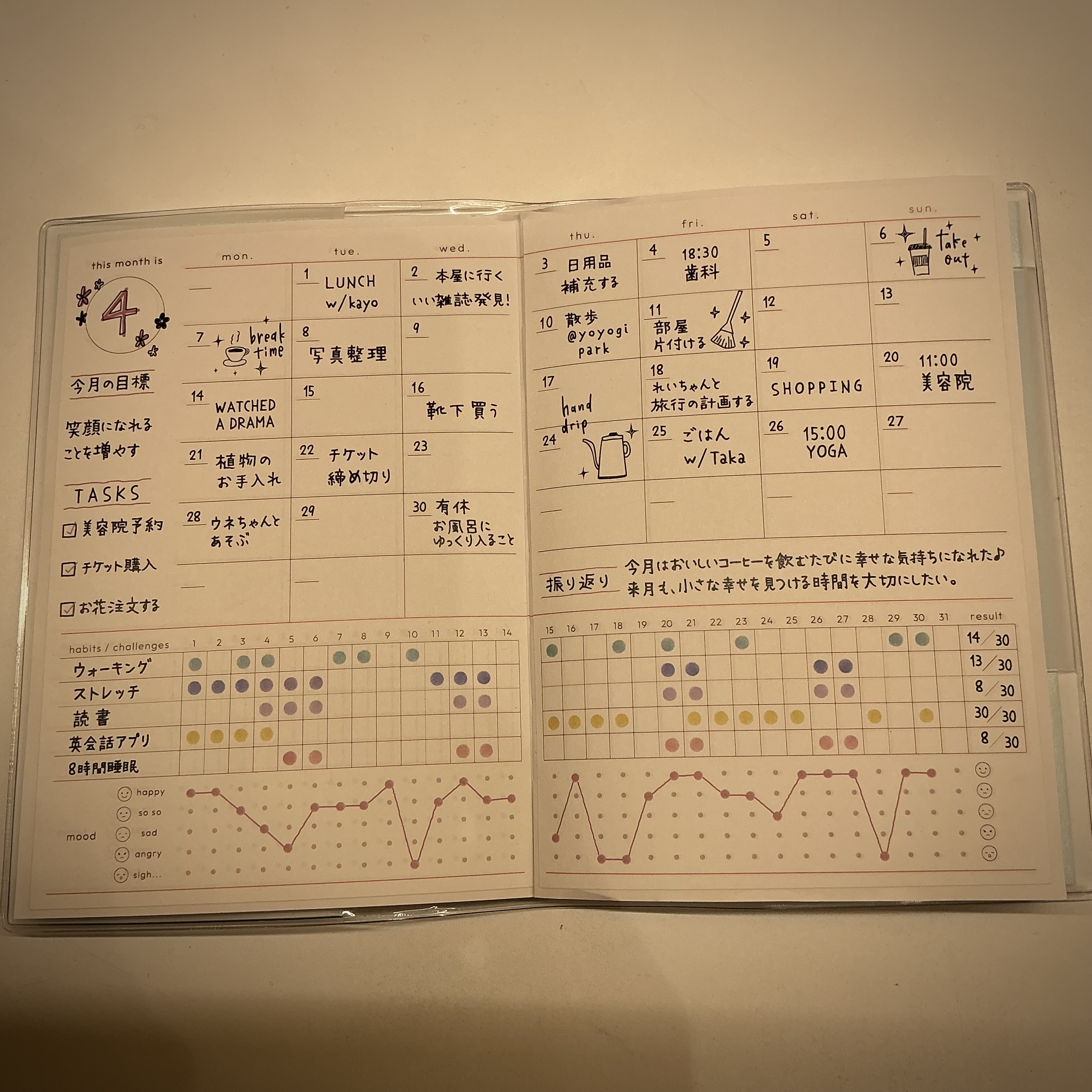 日付が入っていない手帳で日常を記録したり、イラストを描いたり、いつからでも始められる手帳です。サイズもA6サイズなので持ち運びにピッタリ。さらに、可愛いオリジナルチャーム付きです。