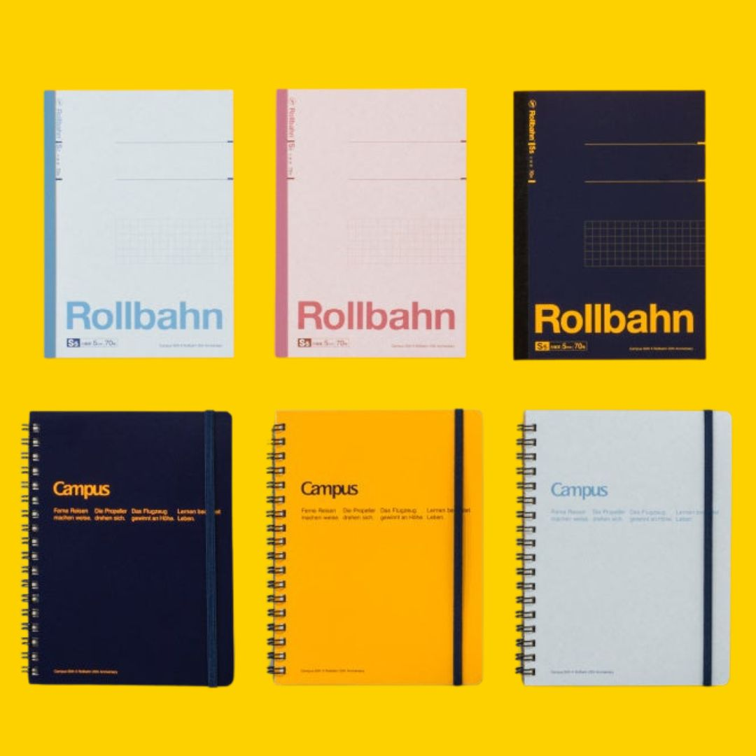 デルフォニックスからは、「キャンパスノートB6サイズ」をベースに、デザインされたロゴは「Rollbahn」、無線とじ製本や記入スペースなどキャンパスノートのデザインながら、中紙は5mm方眼・クリーム色のロルバーン専用用紙で、ライトピンク、ライトブルー、ダークブルーの3色展開。