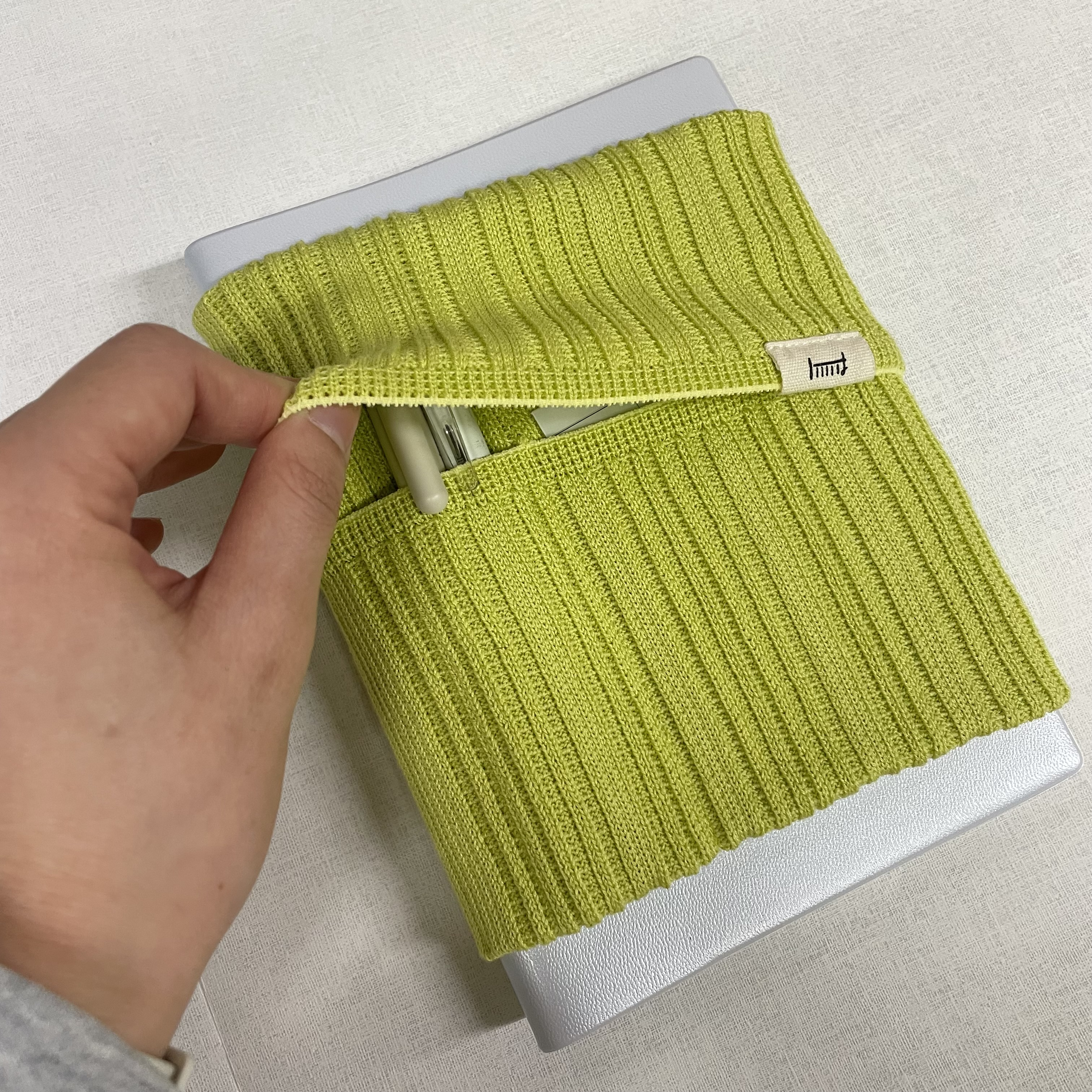 手帳に「はらまき」のように着せる収納ポーチ。ニット素材で編目もあり、ほっこりするかわいらしいデザインです。ポケットにペンや小物を入れて、手帳と一緒に持ち運ぶことができるのも魅力的。また、ニットの部分を折り返してポケットの上に被せると、中身をホールドできるのでバッグの中で散らばってしまう心配もありません。寒いこの季節は、手帳も暖かく持ち運びましょう。