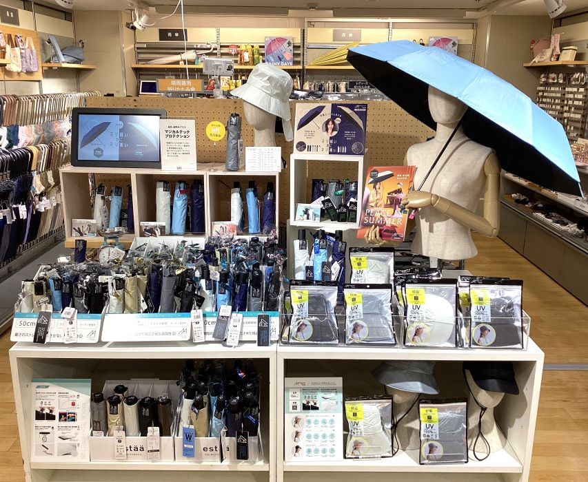 さらに、マジカルテックプロテクションと同じ傘生地を使用した、遮光率・UVカット率100%の帽子も展開中です。雨の日でも安心の撥水加工を施しております。