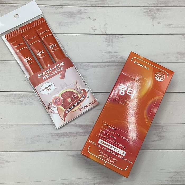 オレンジ色の「リンティー 水分コラーゲン」はブラッドオレンジ味。コラーゲンの他にビタミンCやビタミンEもとることができます。
