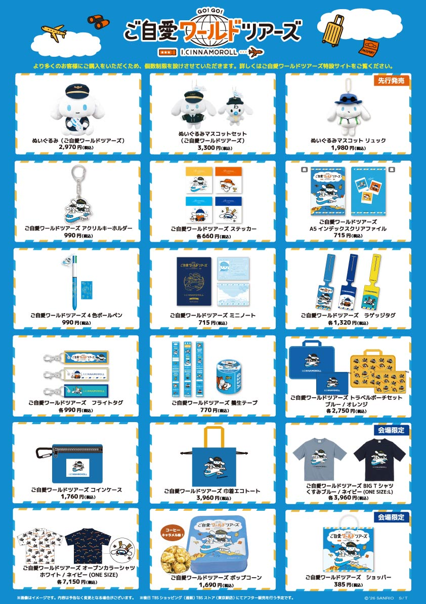 会場では飛行機に乗って世界を旅するシナモロールの描き下ろしイラストグッズを販売、そのほか先着でお買上げプレゼントもご用意いたしております。