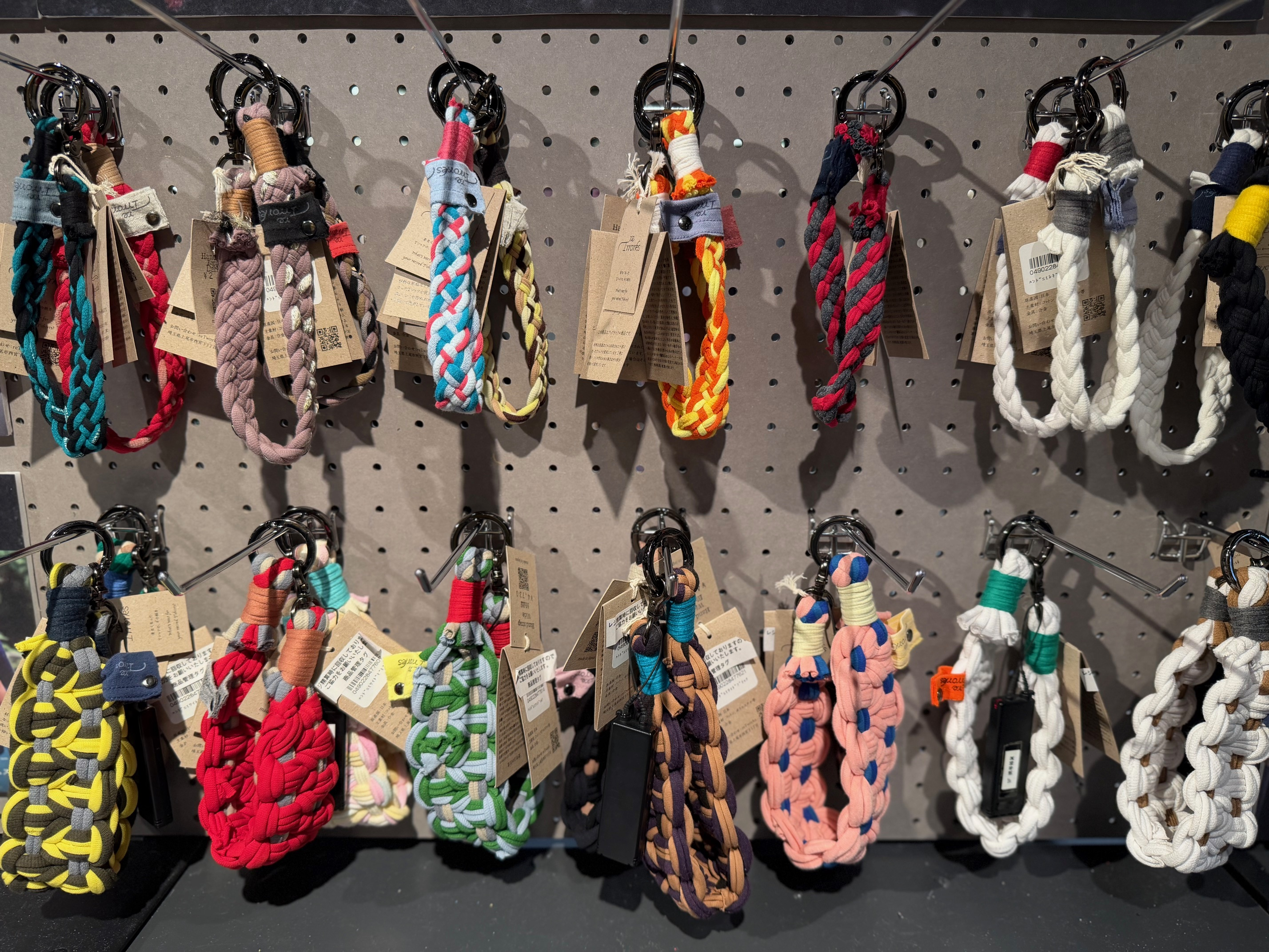 家庭などから回収されたTシャツを、アップサイクルしたスマホストラップ。回収されたTシャツは丁寧に洗い、シミや汚れは除去した布地を使用して作られています。1点1点を作家さんが手作りしており、同じ柄や色合いのものは無く、個性あふれるお気に入りの柄を見つけることが出来るのも魅力的です。スマホストラップのほかに、キーストラップやペットボトルホルダーなどもご用意しています。ぜひ店頭でお気に入りのストラップを見つけてください。