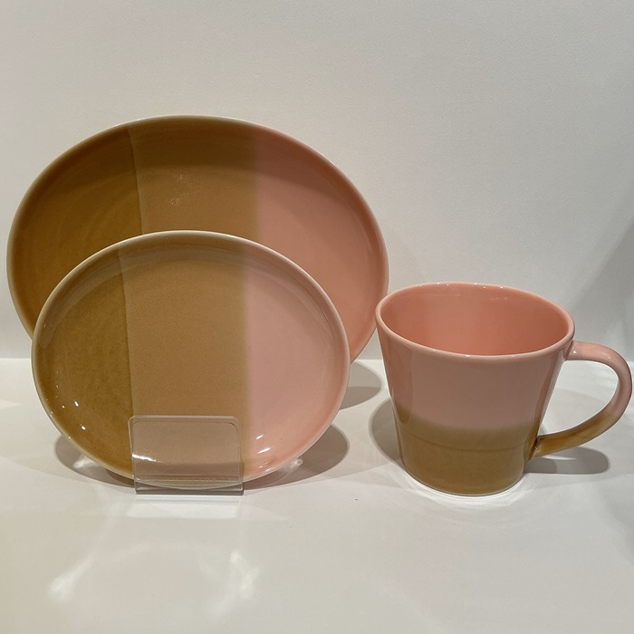 カラーはピンク、ブルー、イエローの3色展開。淡く甘いパステル調に、温もりあるブラウンのグラデーションが食卓を彩ります。