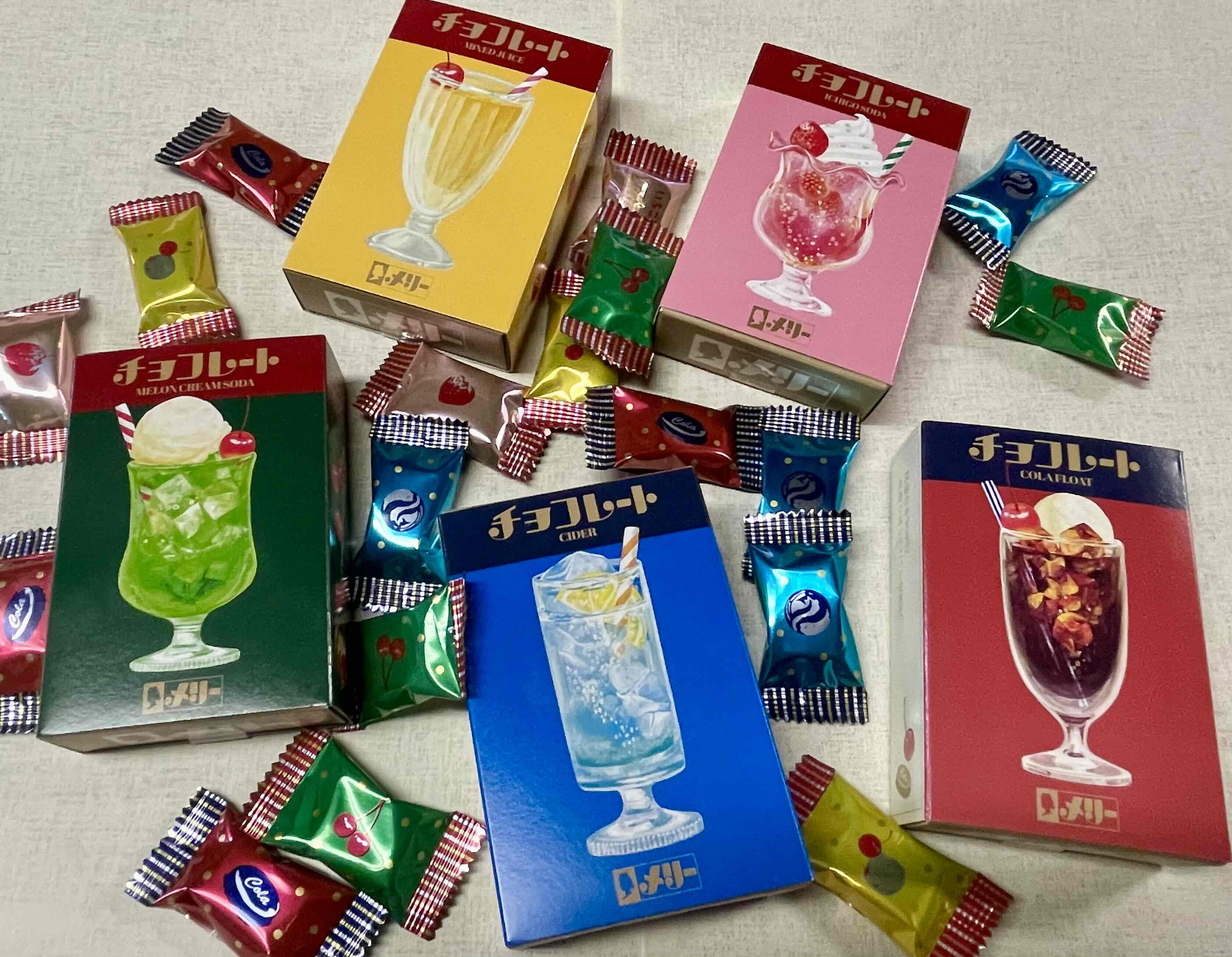 レトロ喫茶に並ぶ、色とりどりのドリンクやスイーツをモチーフにした「はじけるキャンディチョコレート。」。今回は定番のフレーバーに加えて、ミックスジュースのフレーバーが新登場しました。