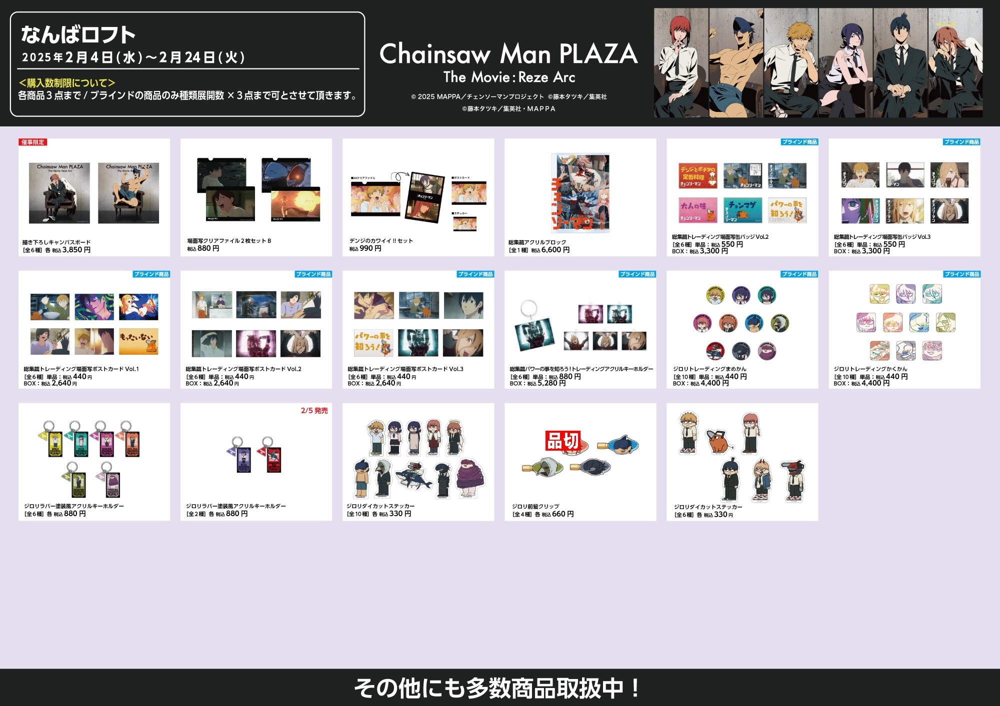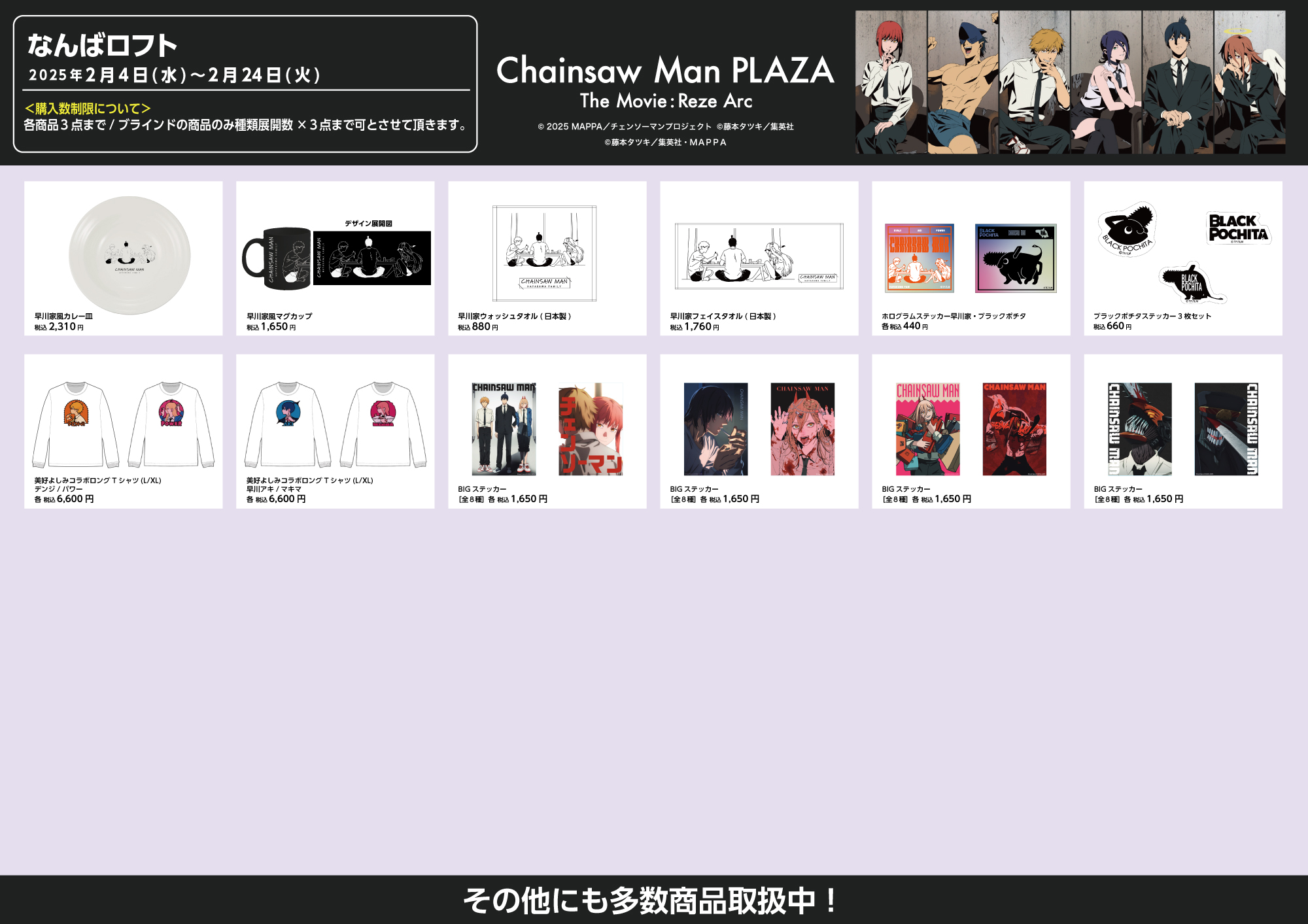 グッズの販売状況は3枚のお品書きパネルをご確認ください。 ※在庫は常に変動いたしますので、お品切れ時はご容赦ください。 ※次回入荷は未定です。 ■会期 2026年2月4日(水)~2月24日(火) ※最終日は午後5時閉場とさせていただきます。 ※2月16日(月)・17日(火)は休館日となります。 「 CHAINSAW MAN PLAZA 」公式Twitterはこちら